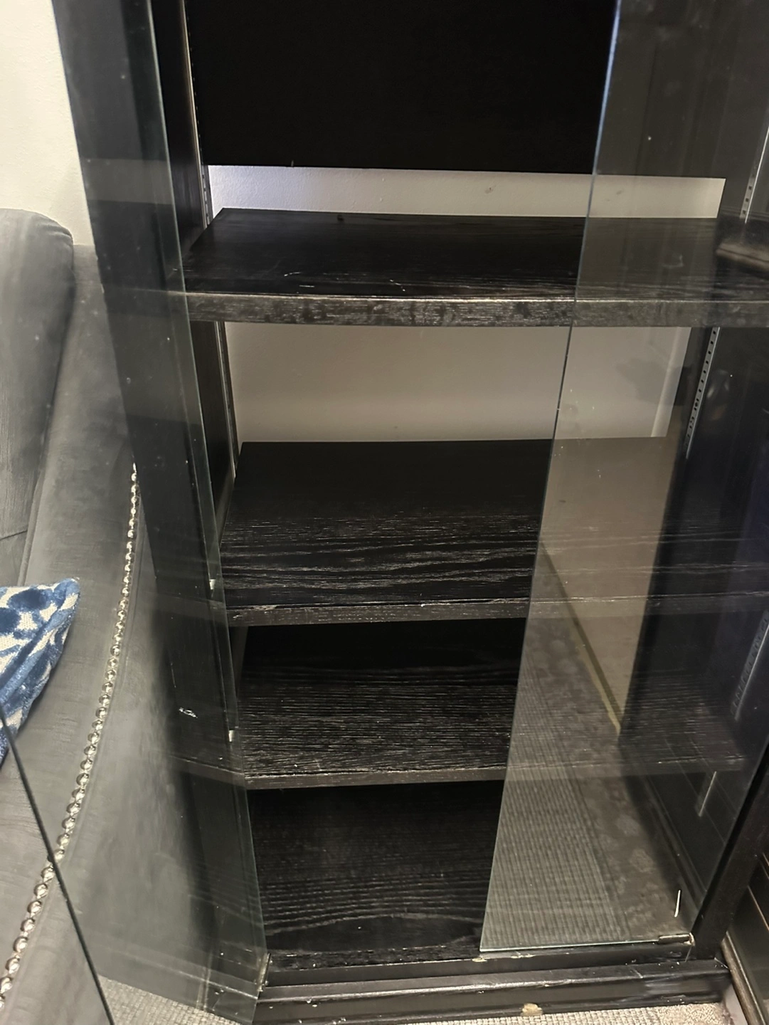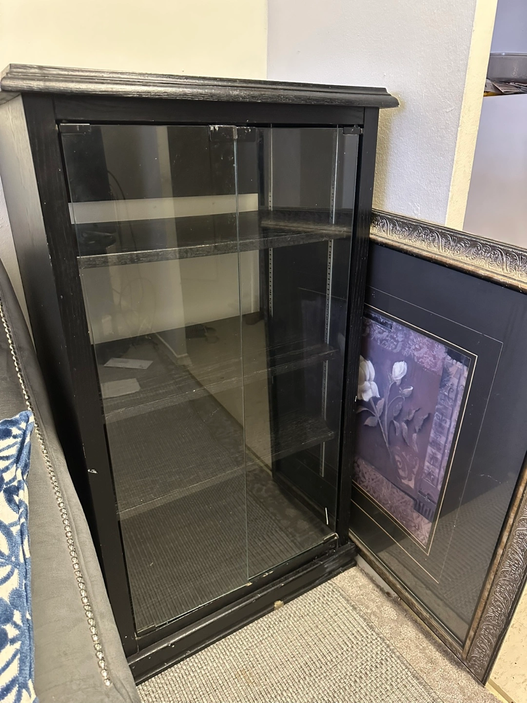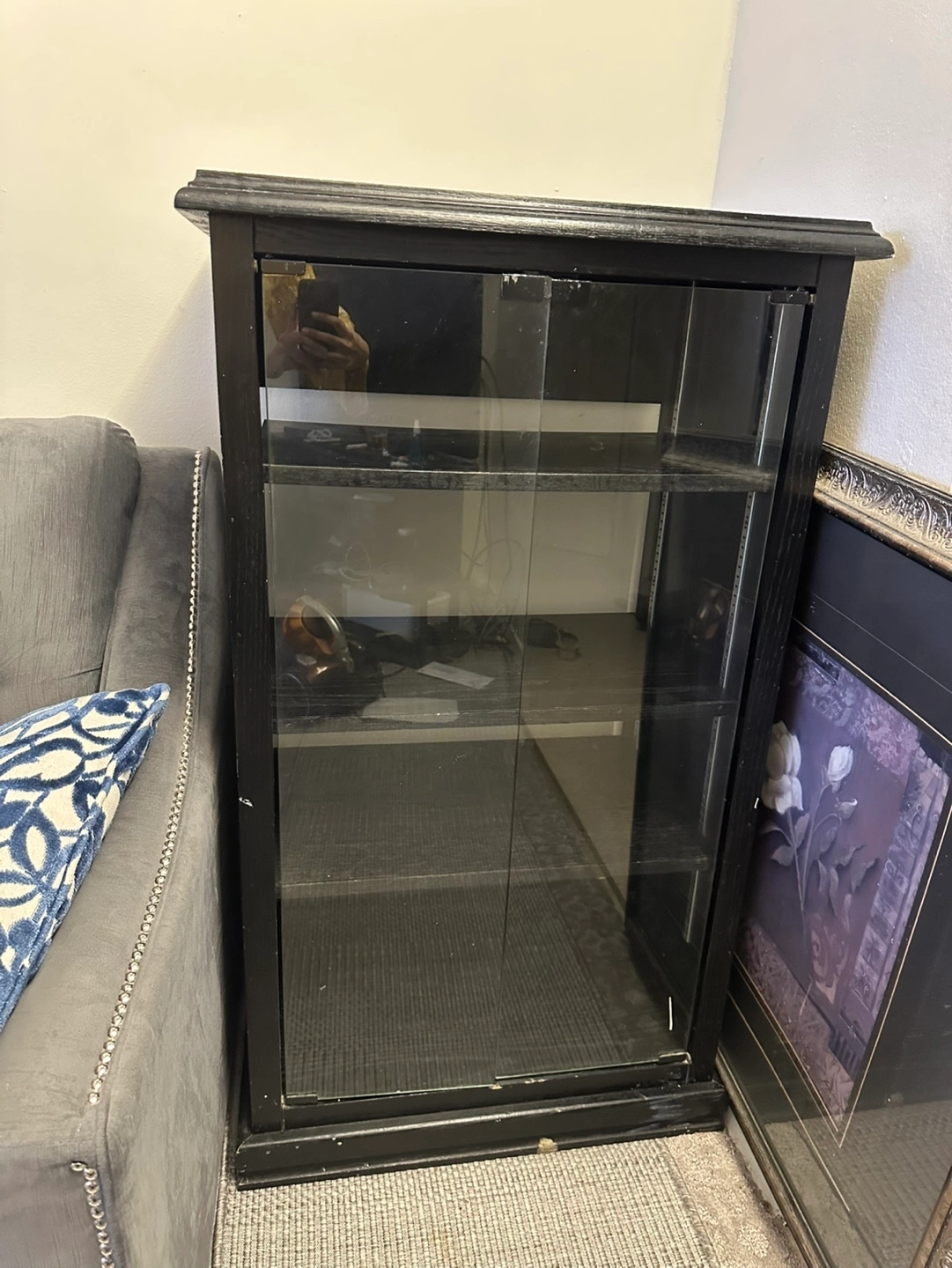 Black wooden cabinet, three shelves, sliding glass doors. Great for displaying collectibles or media. Shows some minor wear.