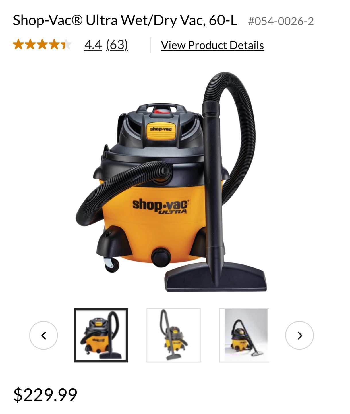 346Shop-Vac Ultra wet/dry vac. 60-litre capacity. Includes various attachments. Pre-owned. Used for demonstration twice.