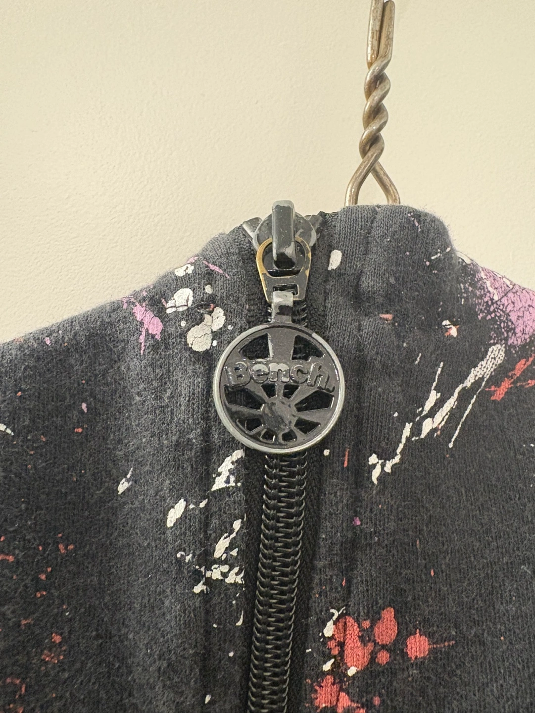 Women's Bench zip-up hoodie. Black with colourful paint splatter print and a pink orange bench logo and hood. Paint on the zipper has faded. Size large but fits tight. Smoke free home.