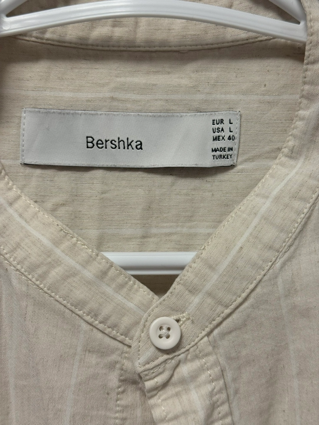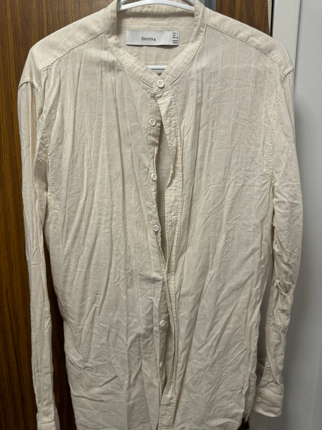 Long-sleeved beige button-up shirt. Features subtle vertical stripes and a mandarin collar. Size large. Made in Turkey.