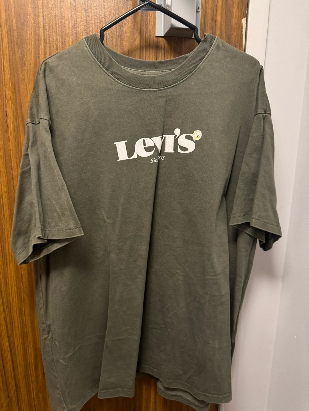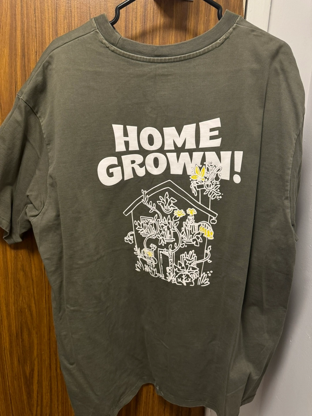 Men's Levi's graphic tee. Olive green colour. Relaxed fit. Size XXL. Features 'Levi's' logo on front and 'Home Grown!' graphic on back.