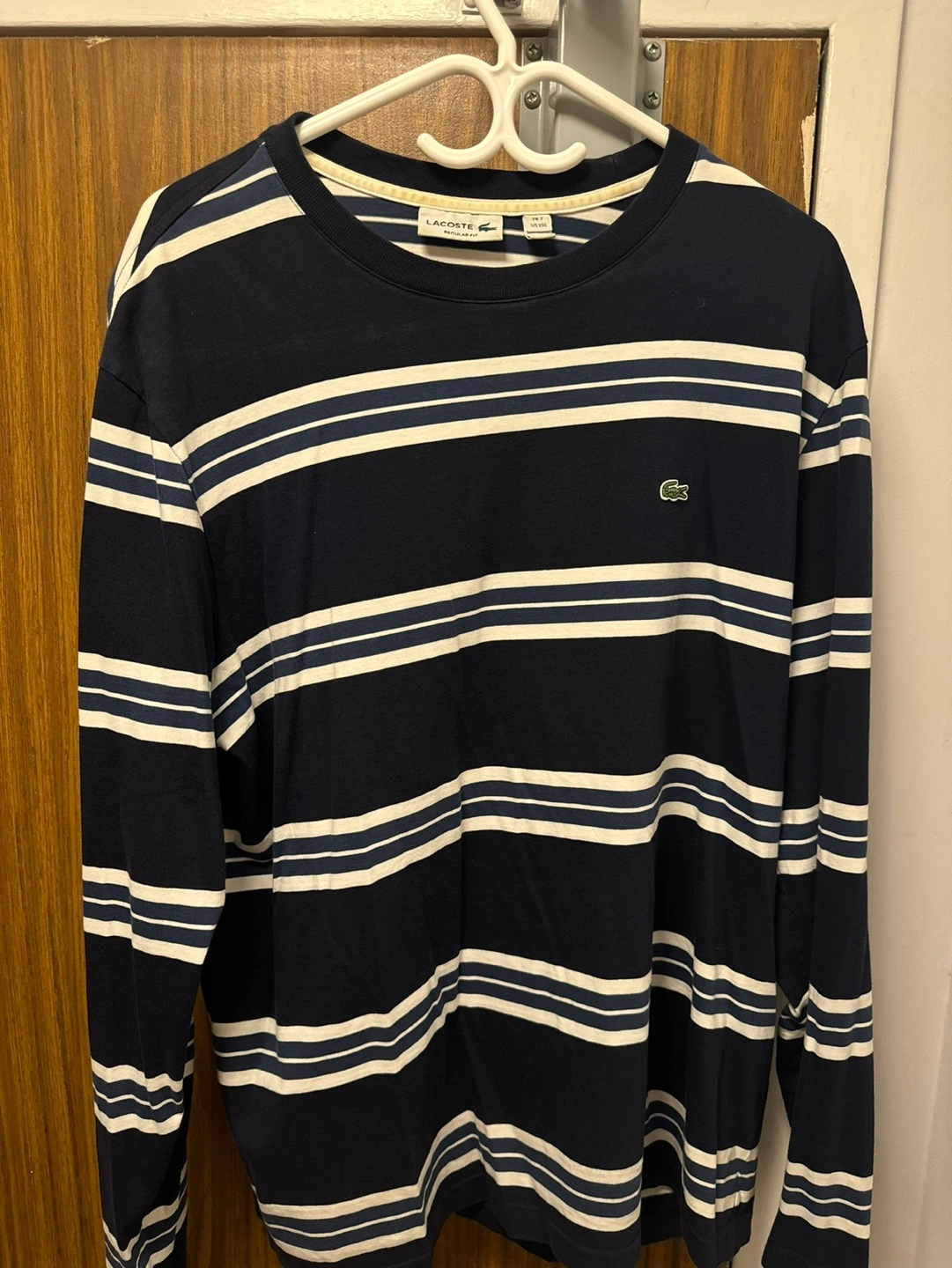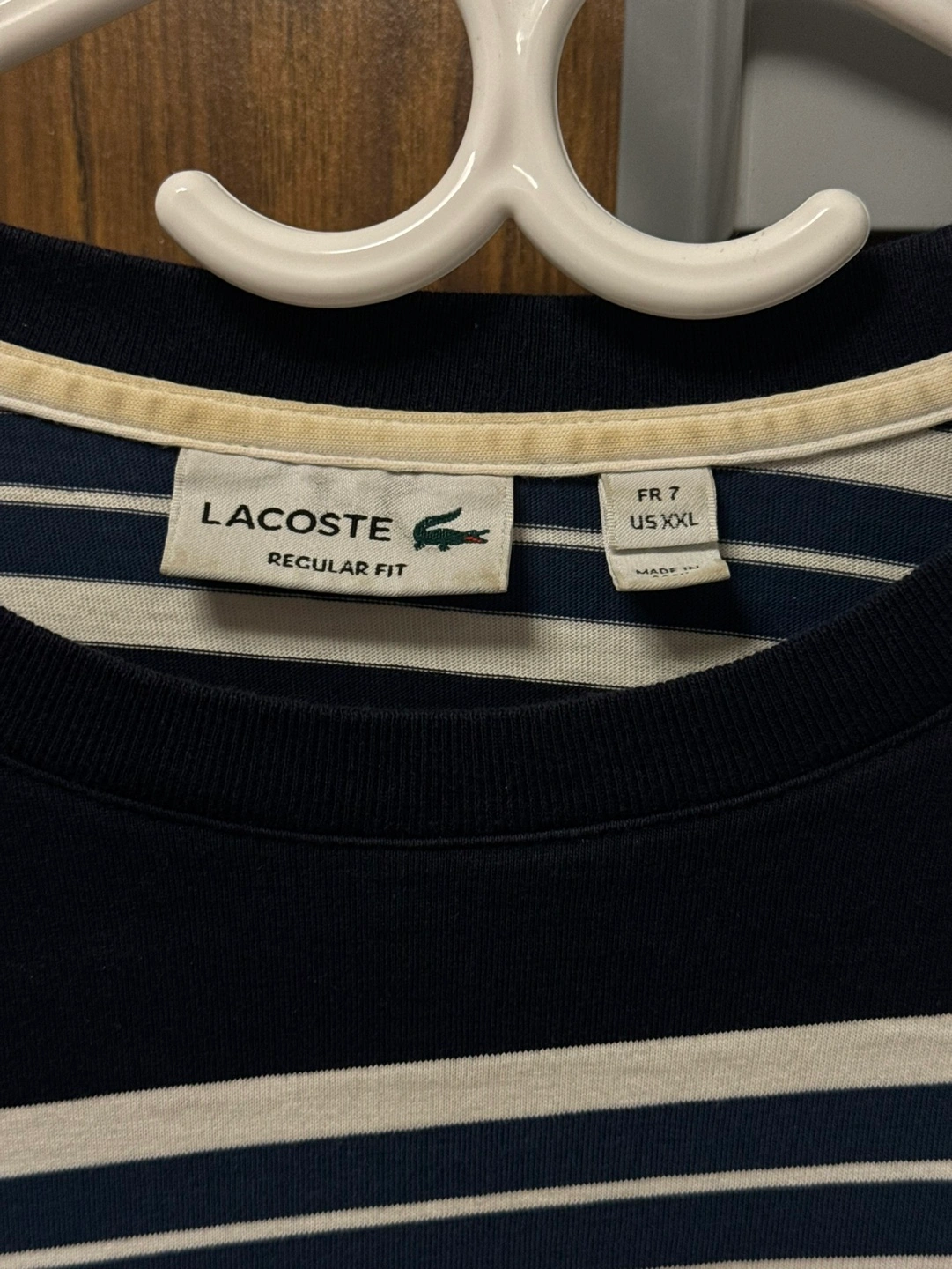 Men's Lacoste long-sleeve shirt. Navy blue and white horizontal stripes. Regular fit. Size XXL but fits like L