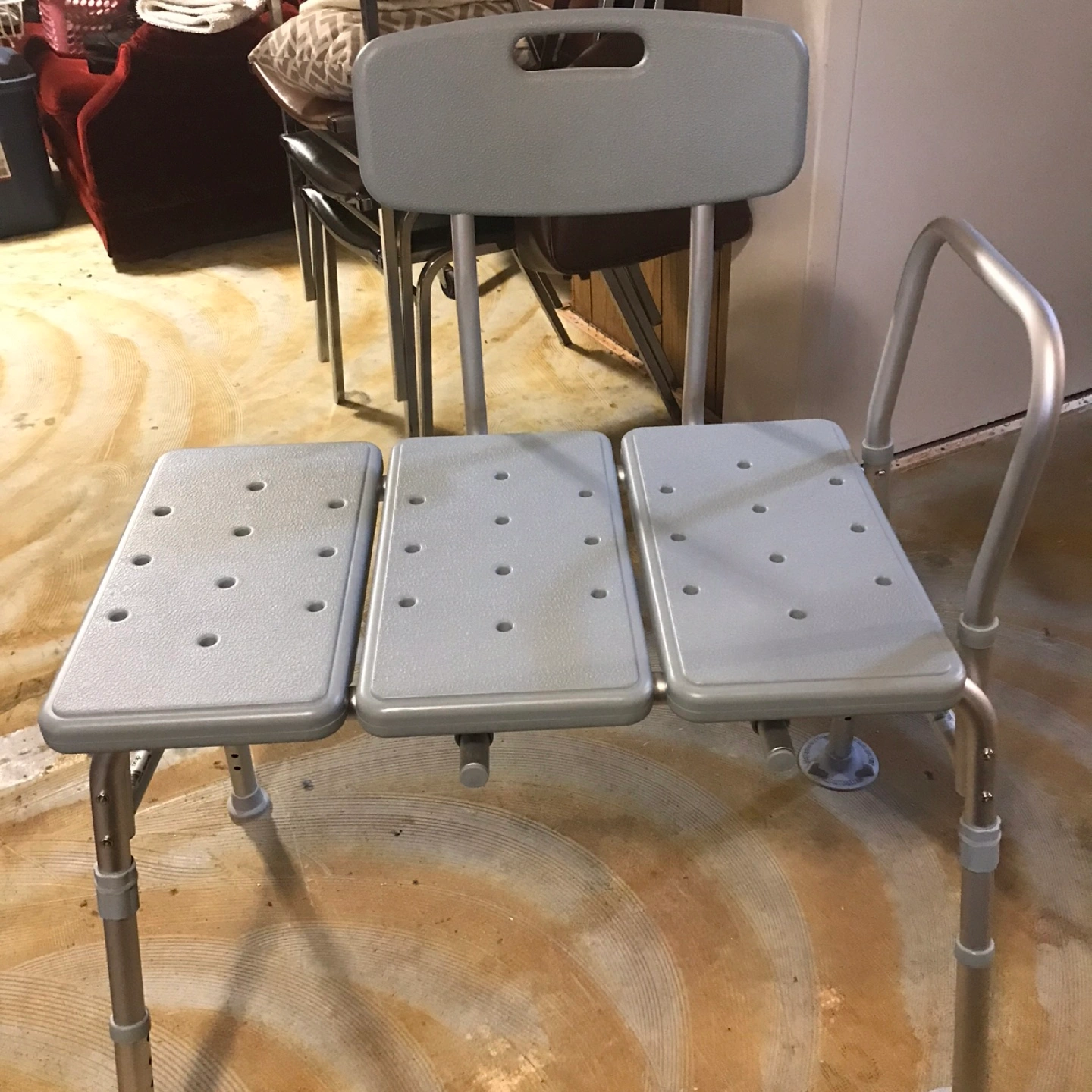 Three-seat shower bench. Features backrest and handrail. Aluminum frame. Grey plastic seat. Good condition.