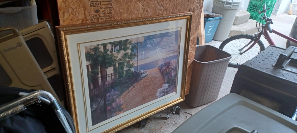113Beautiful landscape print in a gold frame. Picture shows a pathway leading to a house by the ocean. Large size, perfect for a statement piece. 34 x 44 PLEASE CALL NOT TEXT.... 519 729-5862 415 Victoria st south kitchener