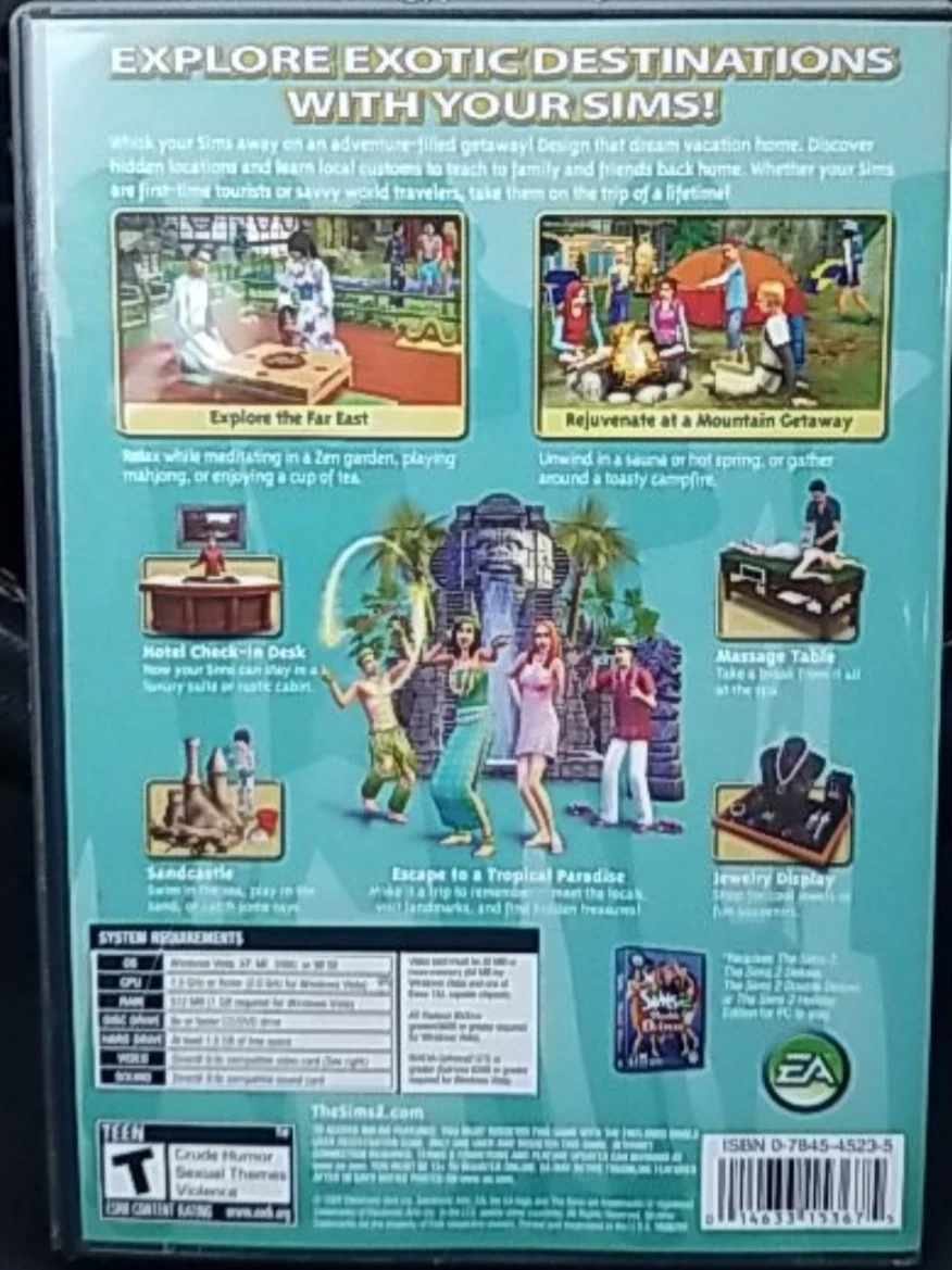 PC game. Expansion pack for The Sims 2. Explore exotic destinations. Design dream vacation homes. Discover hidden locations. Learn local customs. Take family and friends on a trip.
