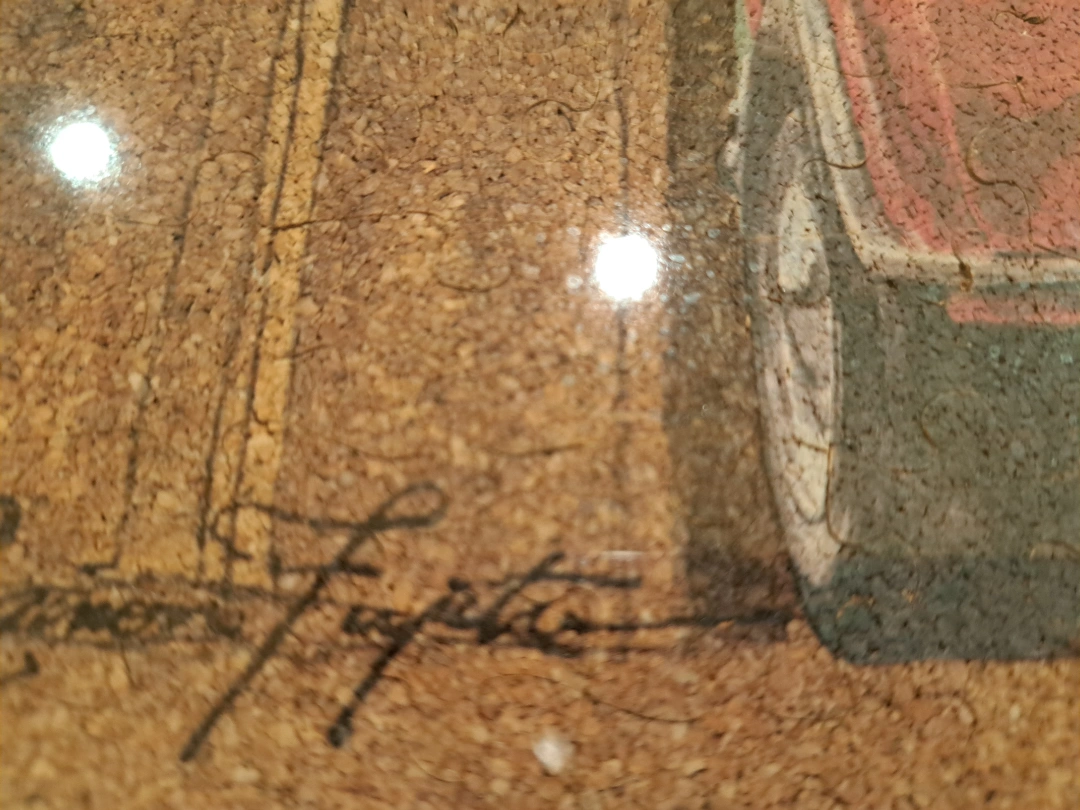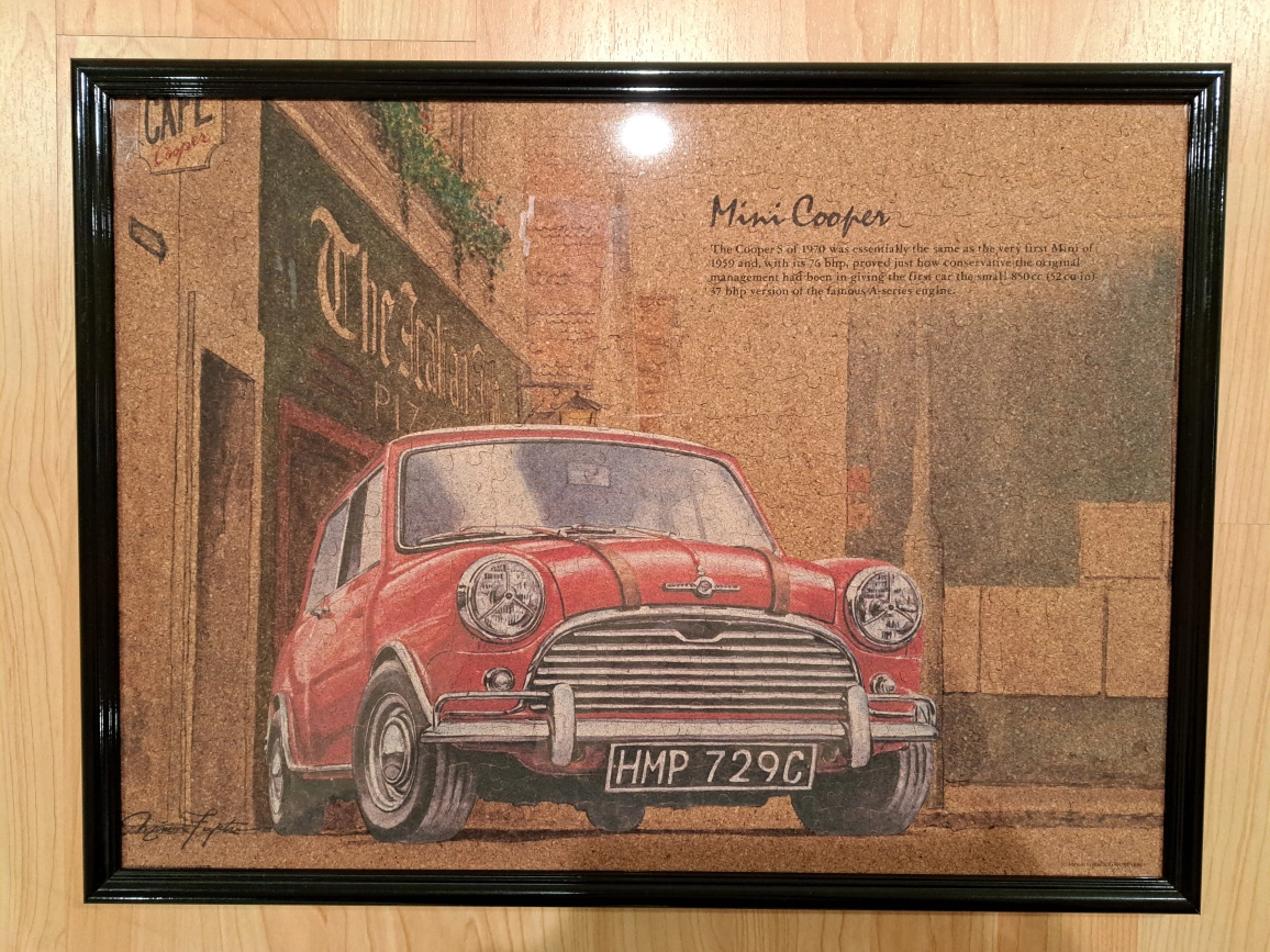 Vintage framed cork puzzle. Depicts a red Mini Cooper. Artist signature visible. Great collectible item.