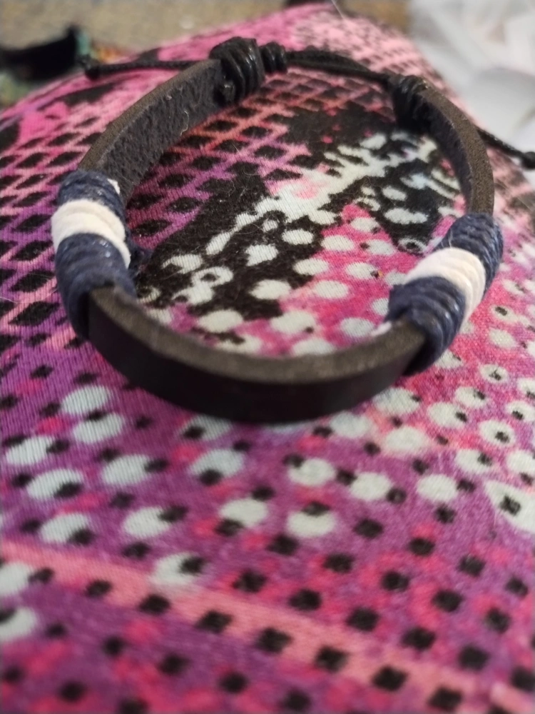 Dark brown leather bracelet. Features woven blue and white accents. Adjustable closure.