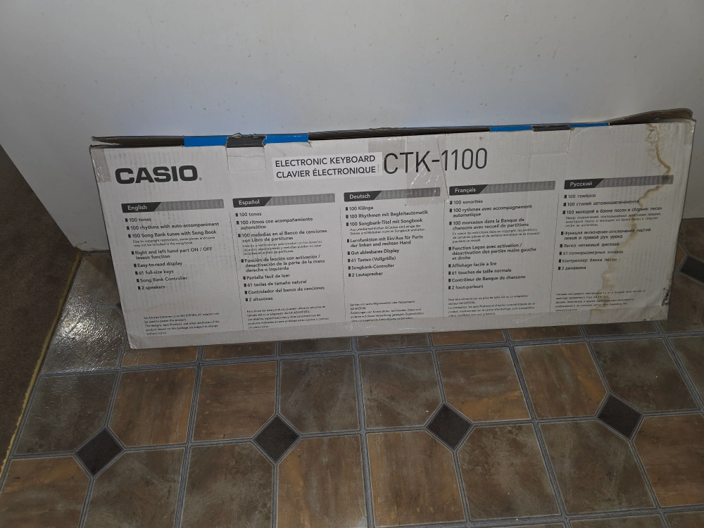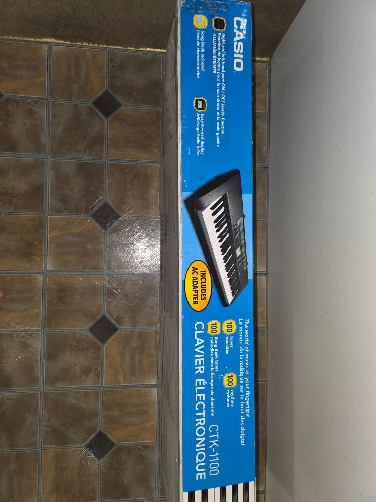 Like new in box. 61 keys. 100 rhythms. 100 tones. Includes AC adapter. The box is little damaged but rest everything is included and works perfectly.