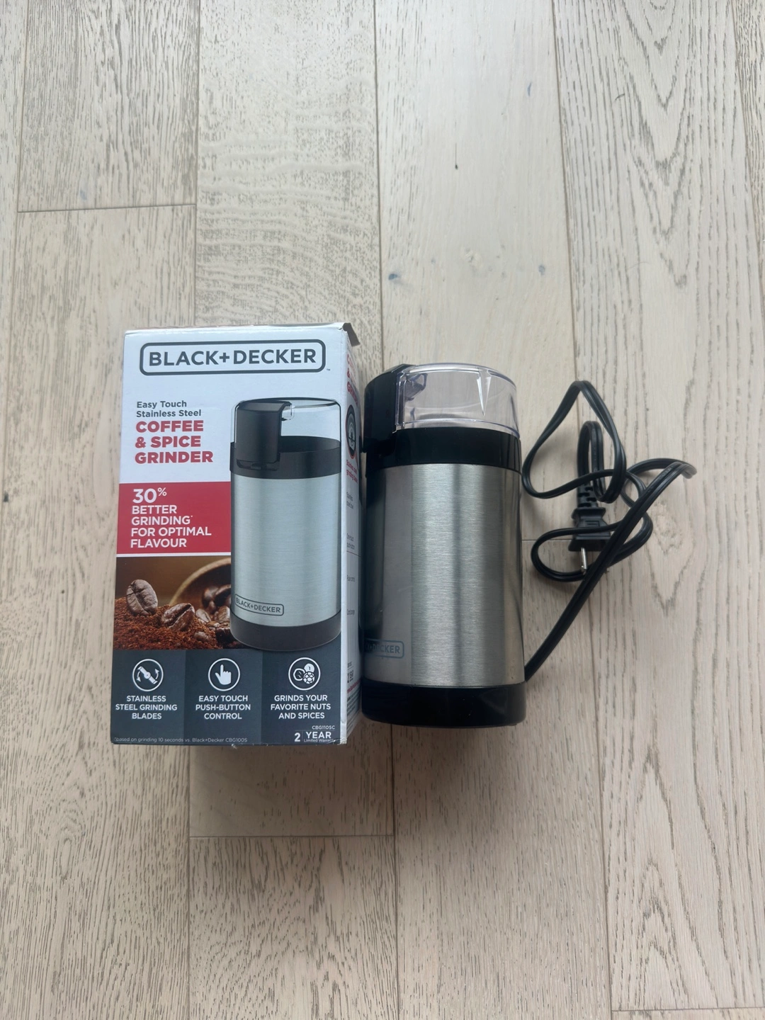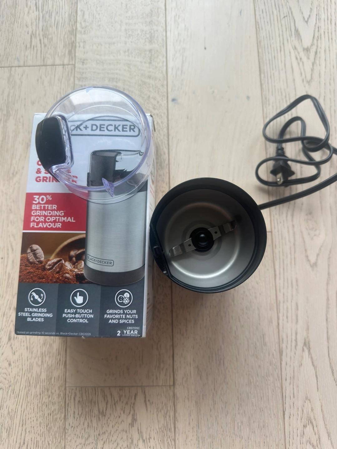 Stainless steel blades. Easy touch push-button control. Grinds coffee, nuts, and spices. 30 second grinding for optimal flavour.