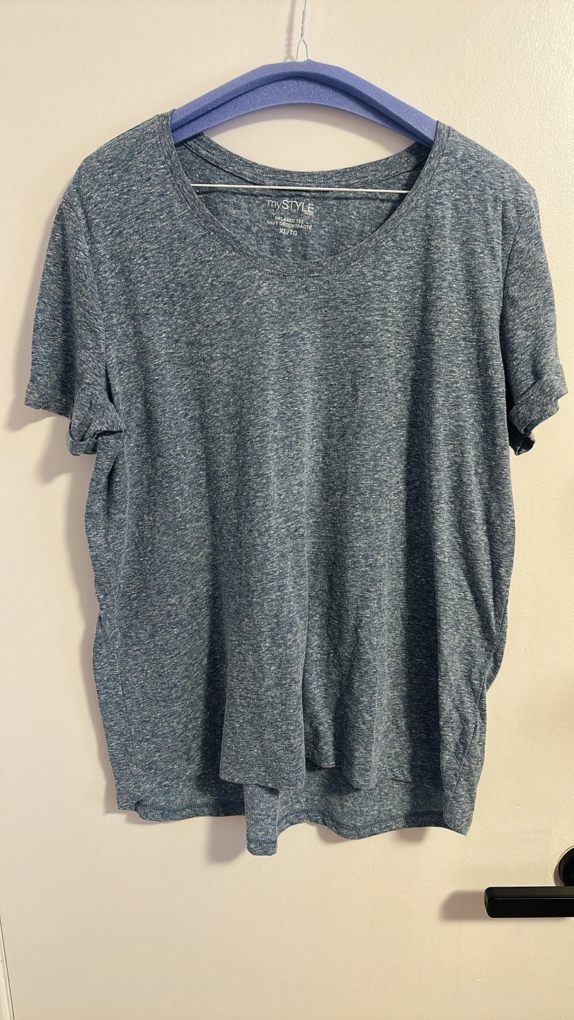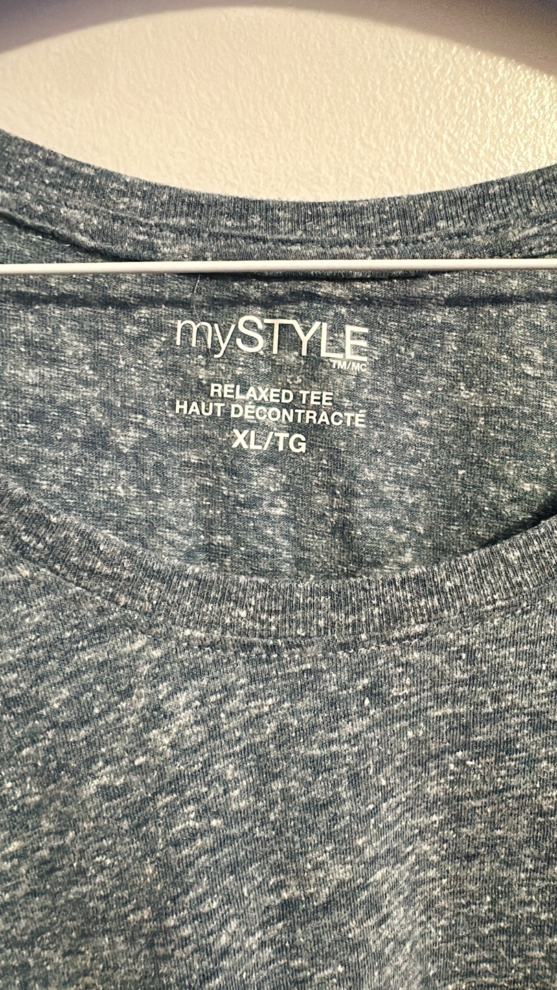 This is a greyish blue t-shirt in relaxed fit by myStyle. It is in size XL, but do consider it might run large for slender body types.