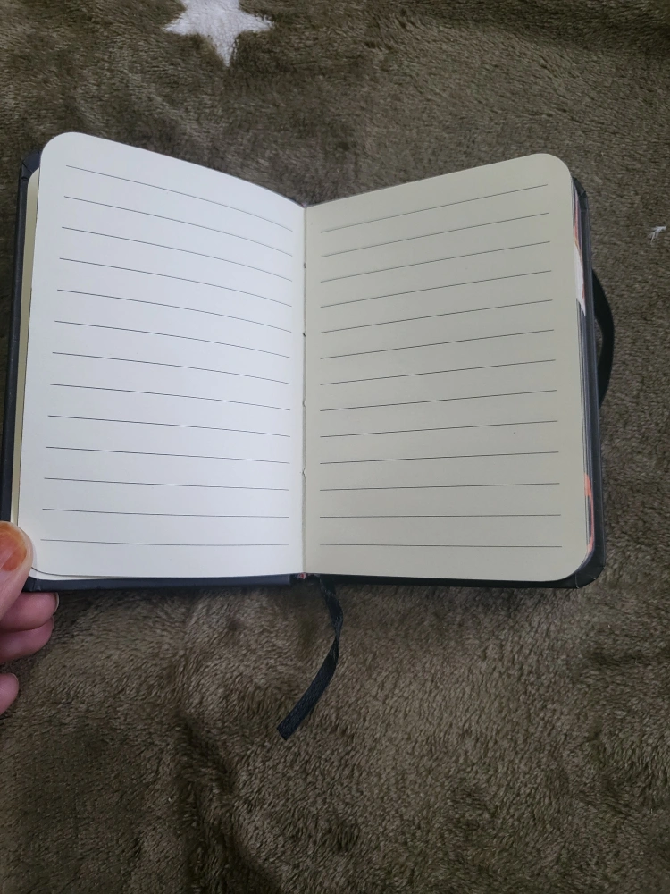 Small notebook featuring pink flamingos on a black cover. Elastic closure. Lined pages. Perfect for jotting down notes or ideas.