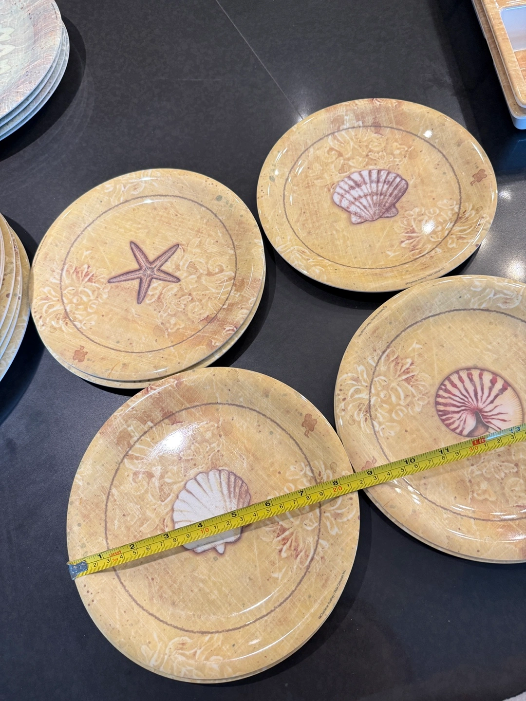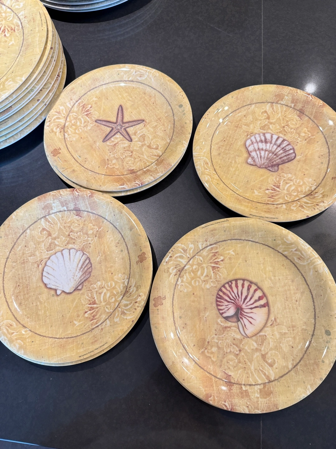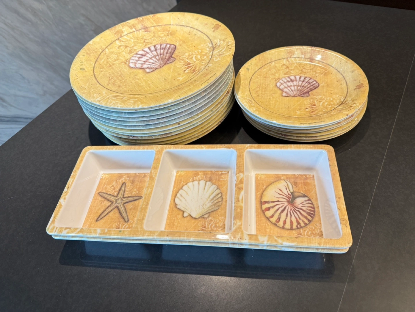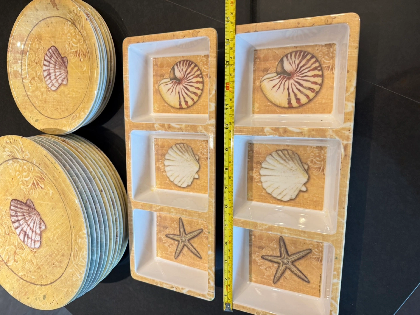 481Total 22items Set of plates and a serving tray. 2 tray with 3 compartment. 7-salad plates 13-large plates Features a seashell design. beige colour scheme. Great for casual dining.