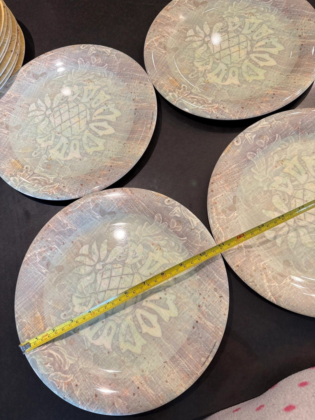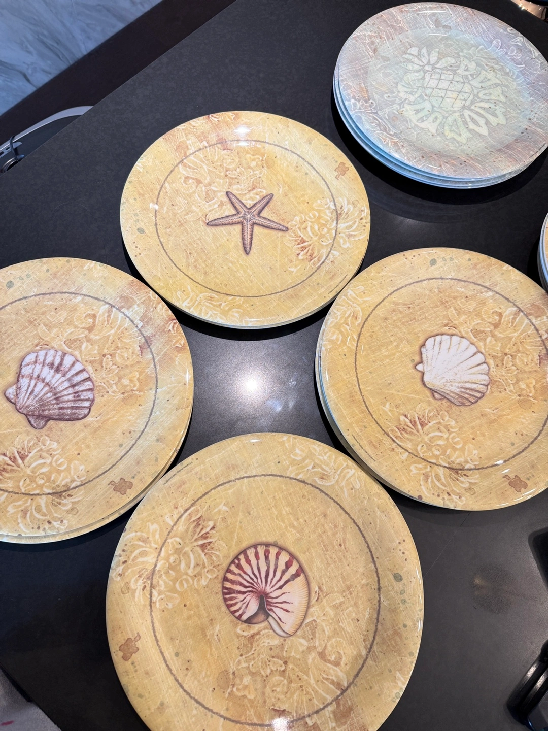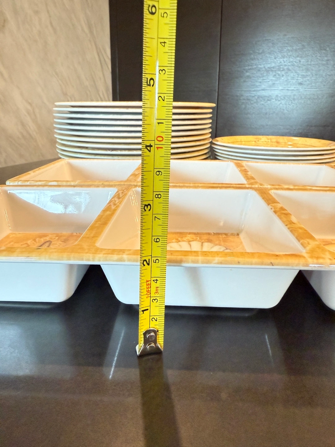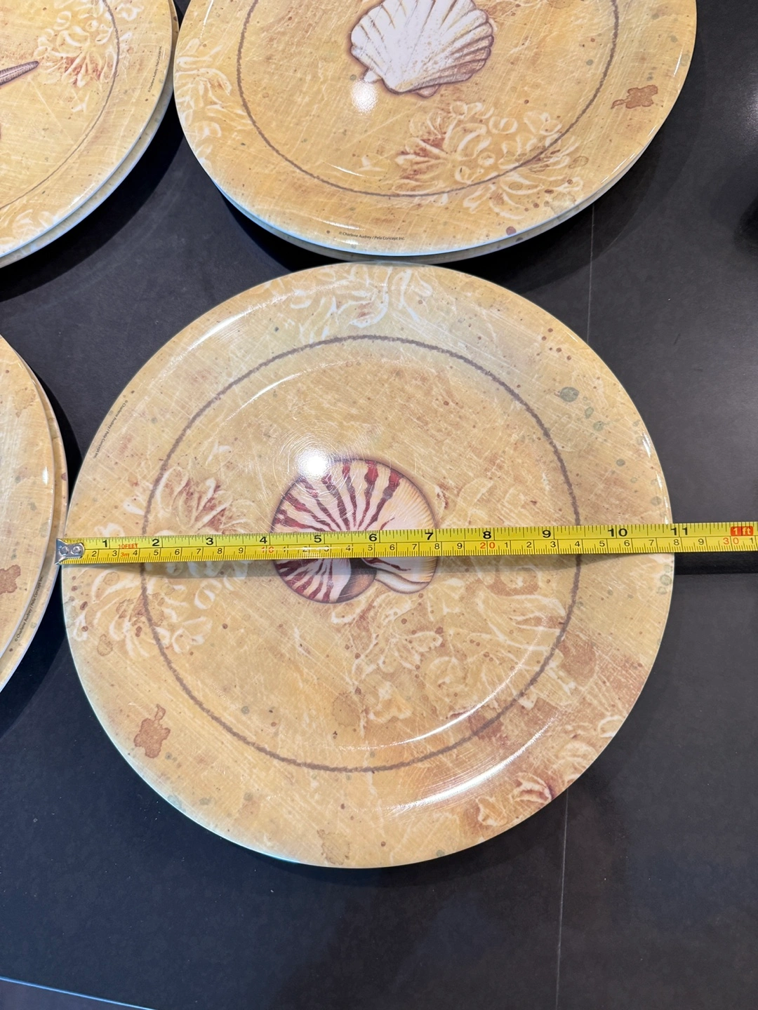 481Total 22items Set of plates and a serving tray. 2 tray with 3 compartment. 7-salad plates 13-large plates Features a seashell design. beige colour scheme. Great for casual dining.