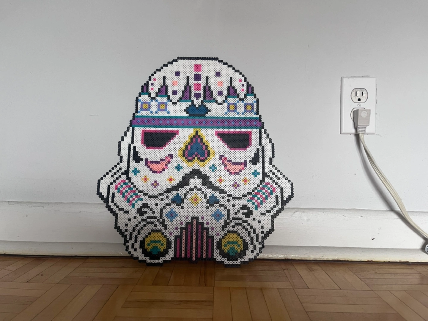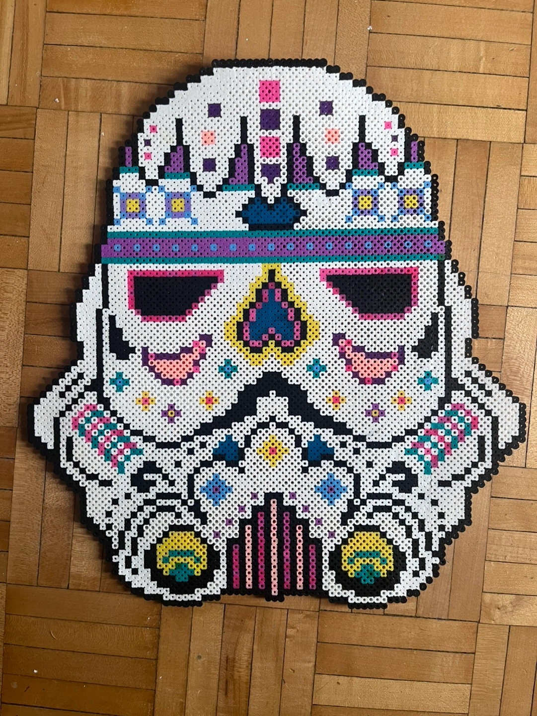 Handmade groovy looking Stormtrooper made from perler beads. Can easily be mounted to a wall or displayed on an easel.