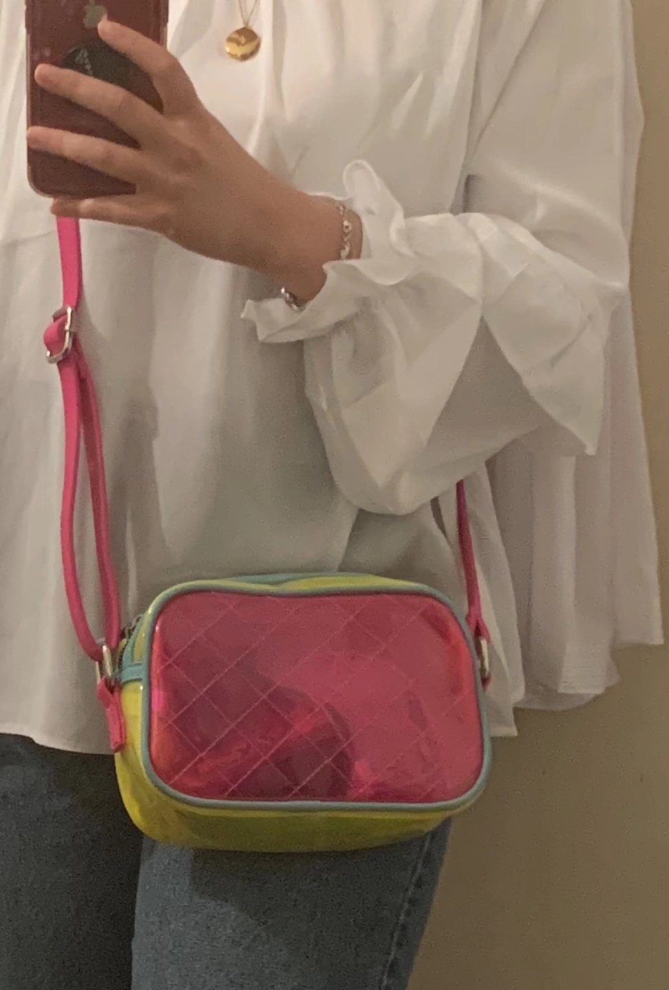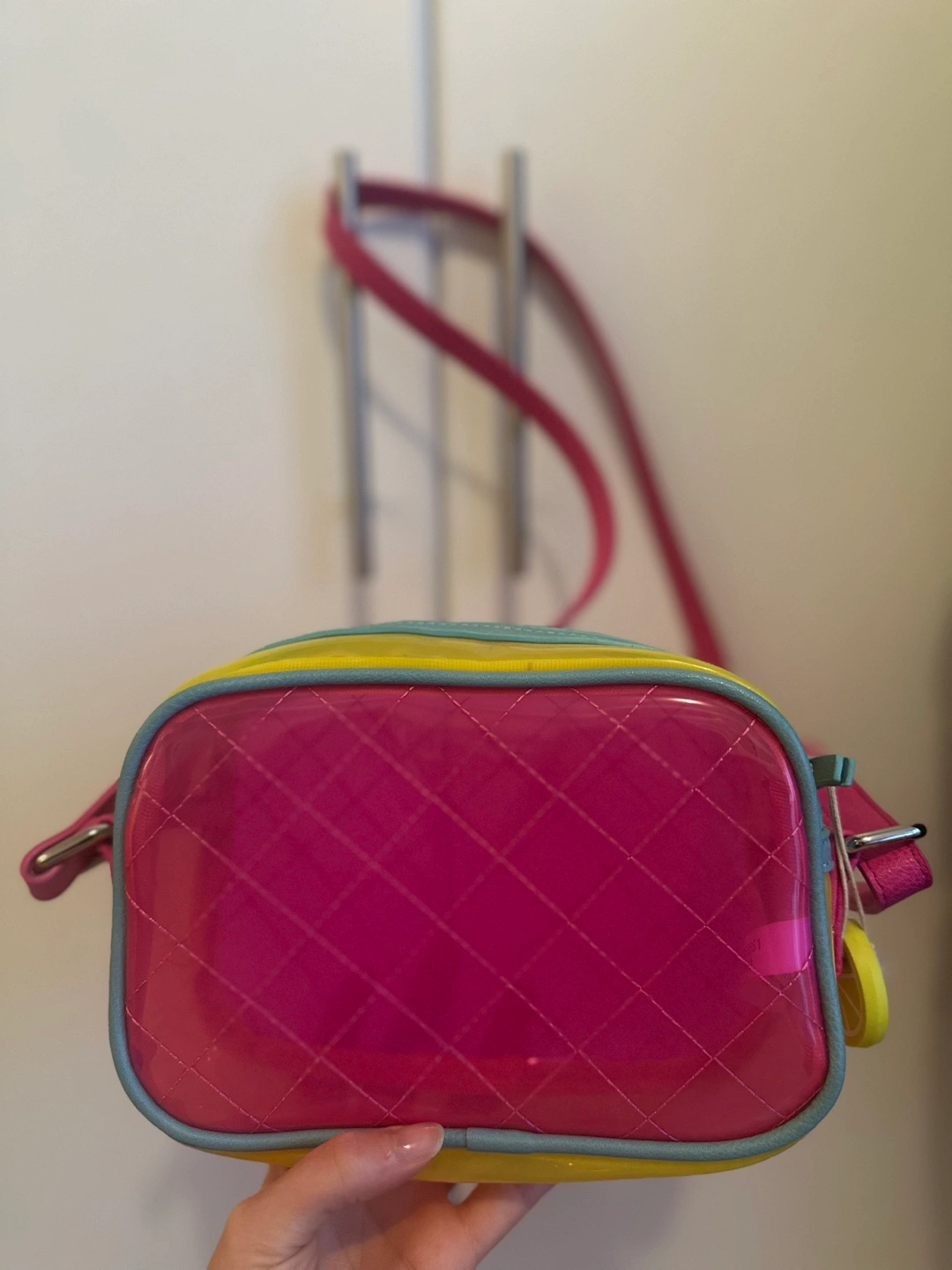 Clear crossbody bag. Pink and yellow colour scheme. Adjustable strap. Quilted pink interior visible through the clear exterior. Small size, perfect for essentials.