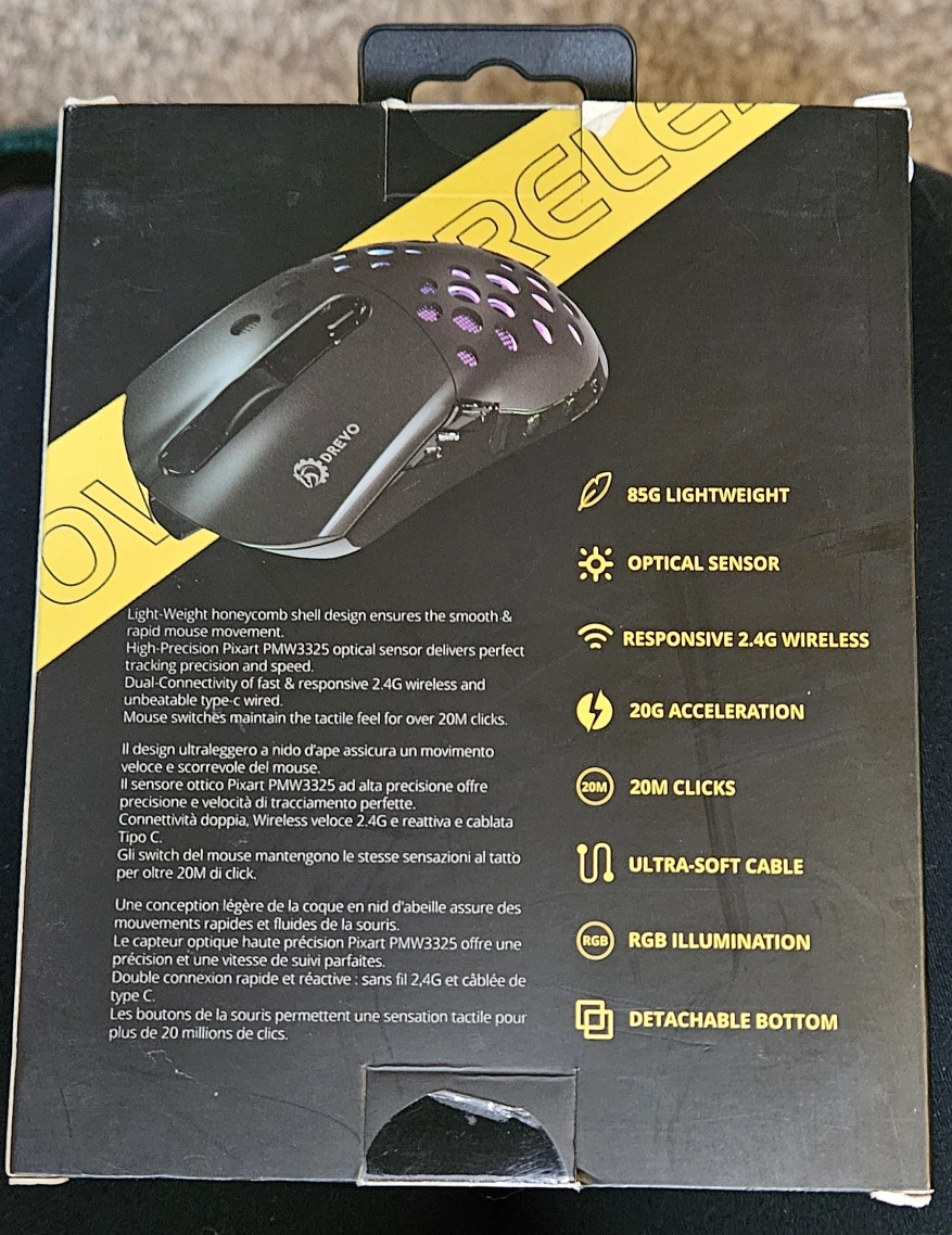 10Wireless gaming mouse. Lightweight honeycomb design. High-precision optical sensor. 2.4G wireless & wired. RGB illumination.
