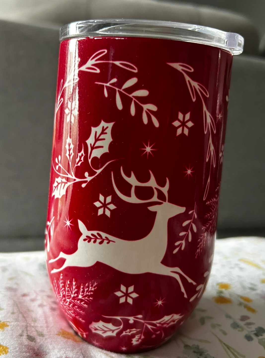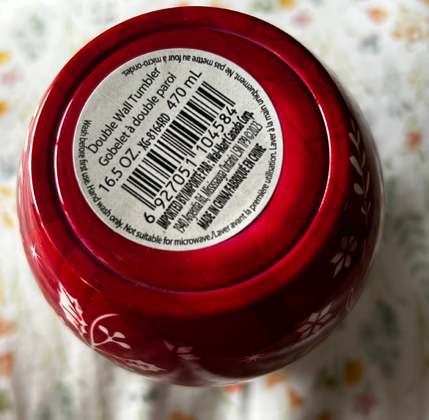 Double-walled insulated tumbler. Features a festive reindeer design. Holds 16.5 oz (470 mL). Hand wash only. Not microwave safe.