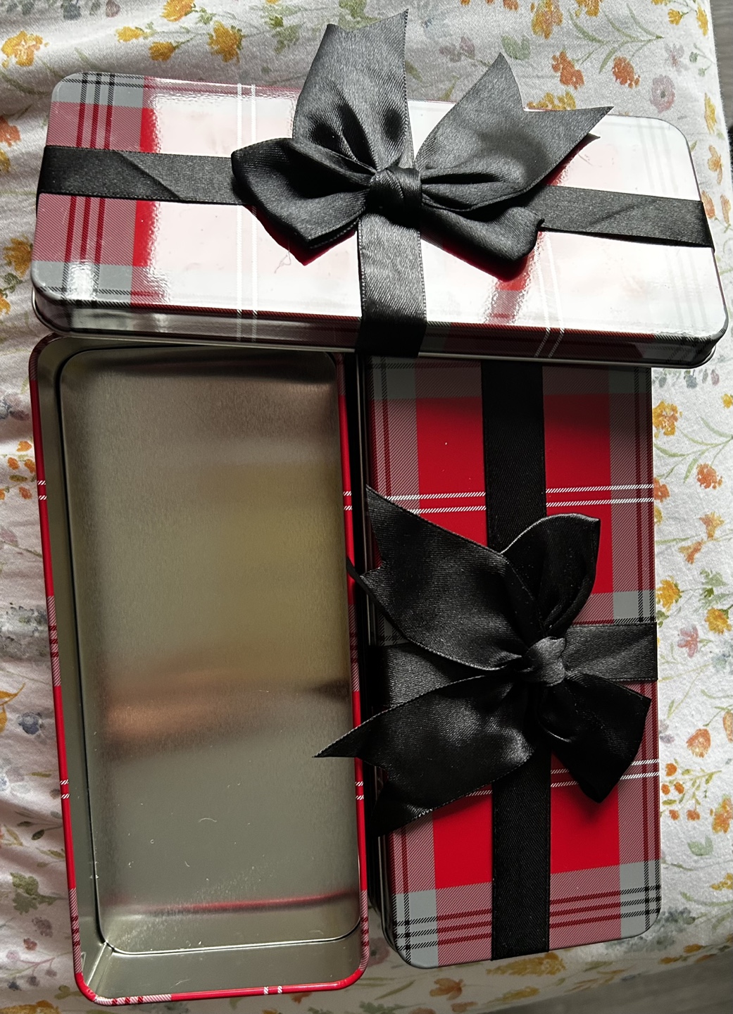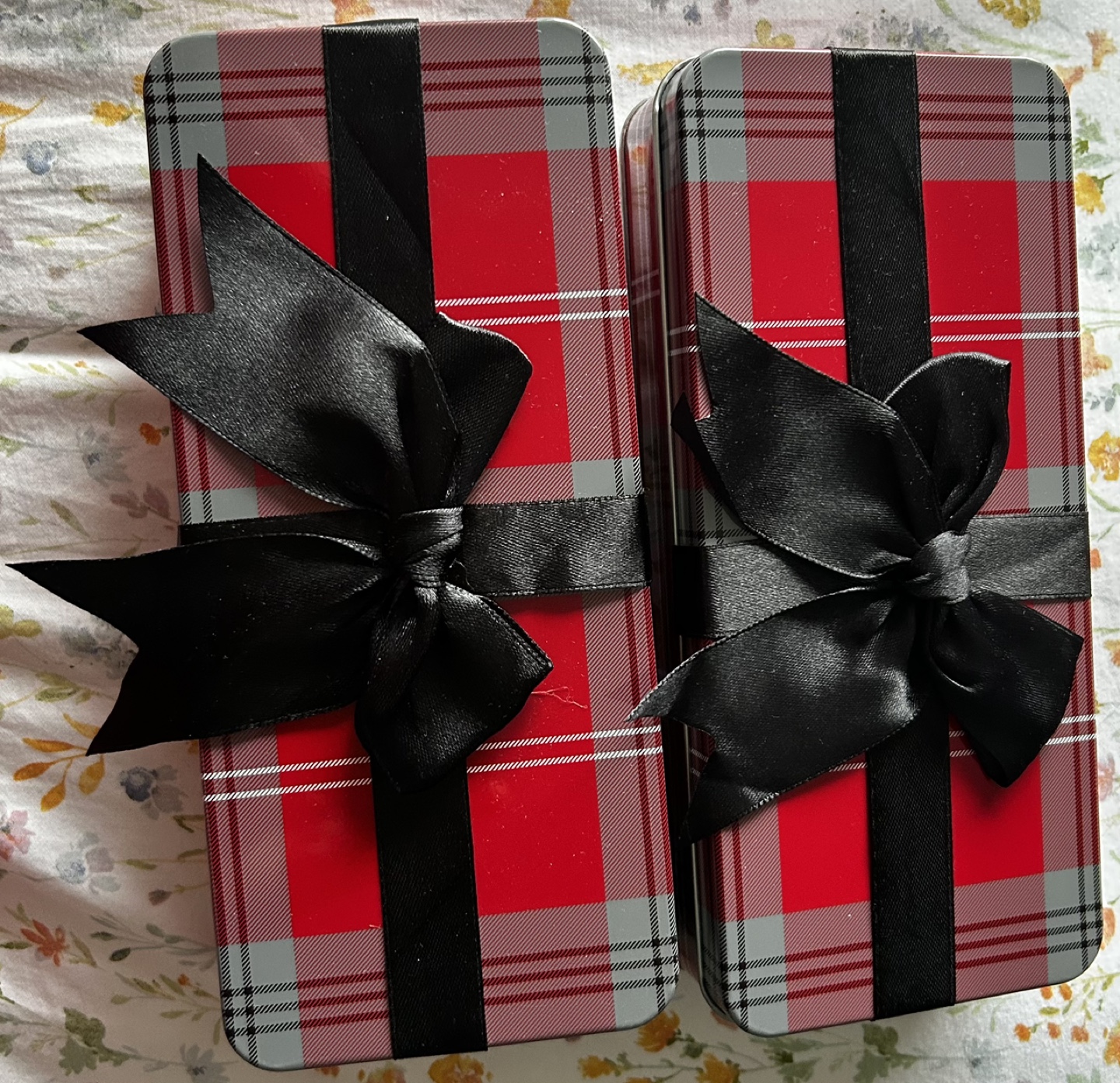 Two Red Plaid Metal Gift Tins with Black Bows