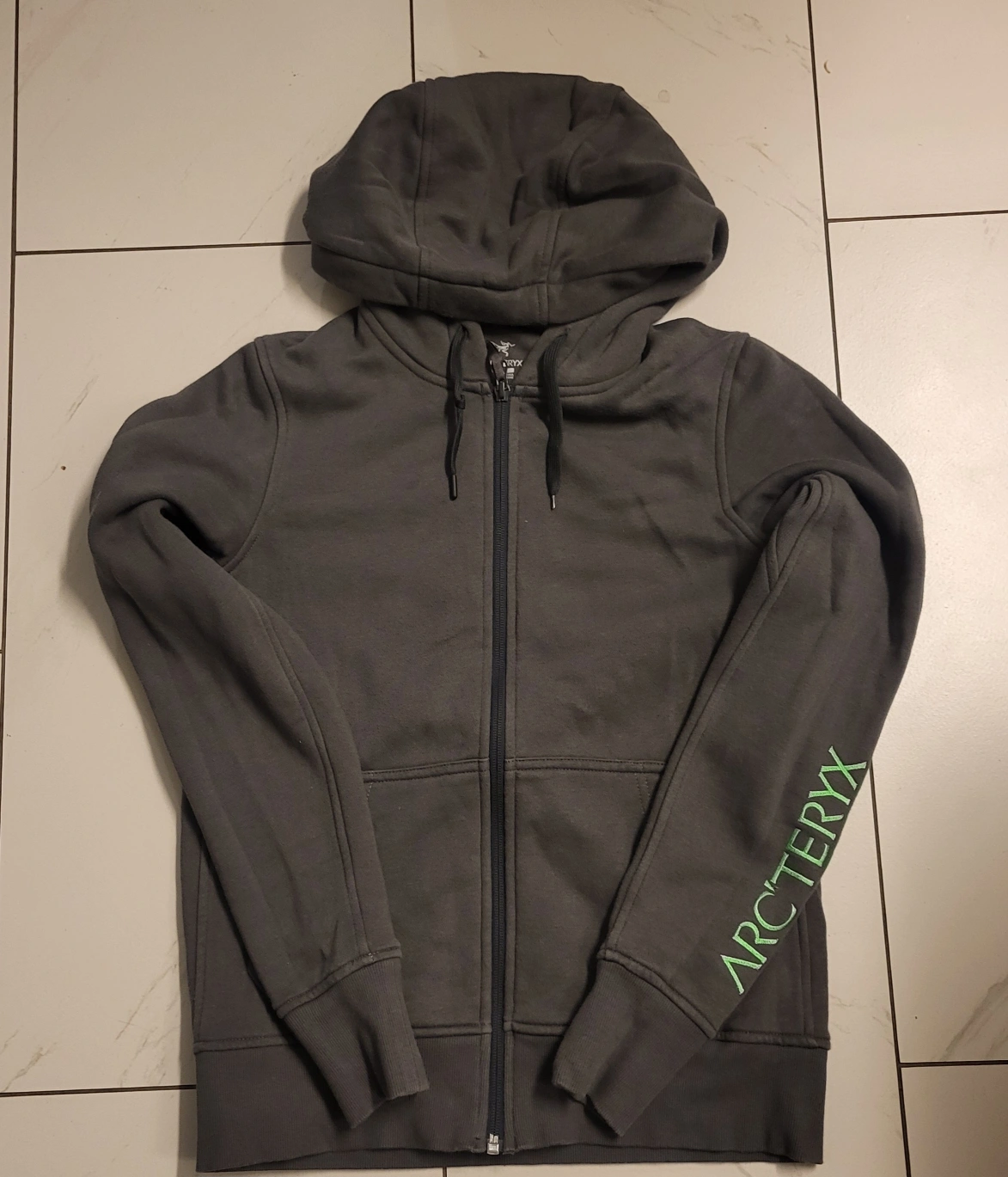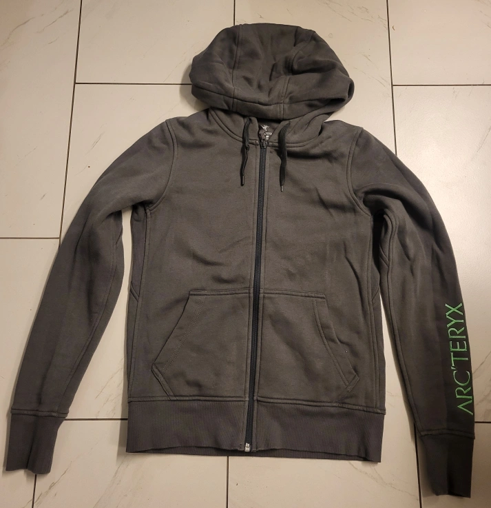 Women's Arc'teryx zip-up hoodie. Size medium. Grey colour. Long sleeves. Front pouch pocket. Arc'teryx logo on sleeve.