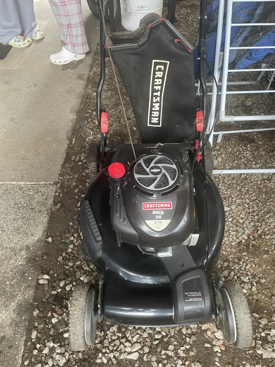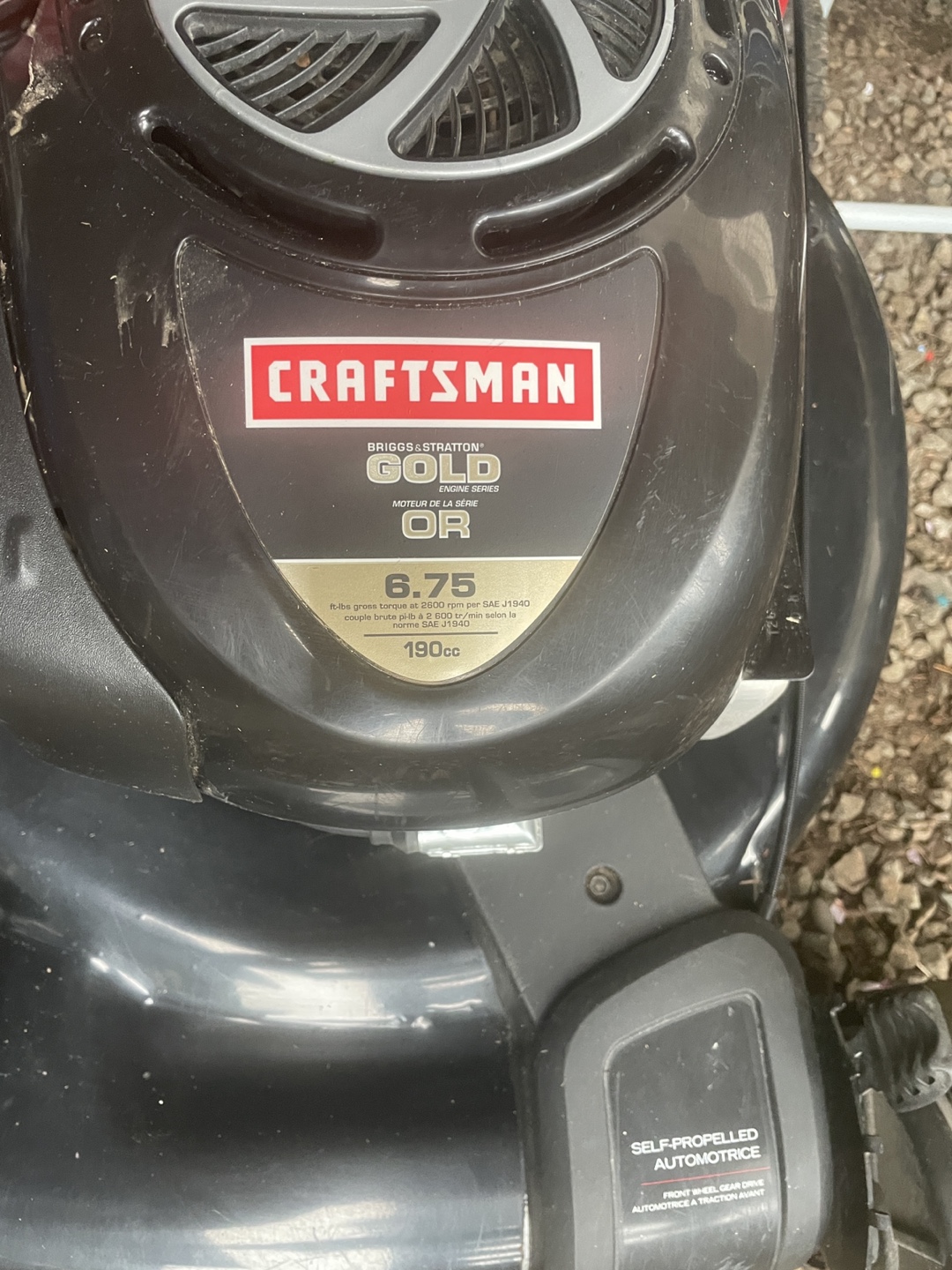 Craftsman lawnmower, self-propelled. Briggs & Stratton 6.75 Gold Series engine. 190cc. Front wheel gear drive. Cared for like a new car, routine oil changes, cleaned after use and stored indoors. Freshly tuned up and oil changed. We're downsizing and have an electric one. Handle folds down so it'll fit in the trunk of a car.