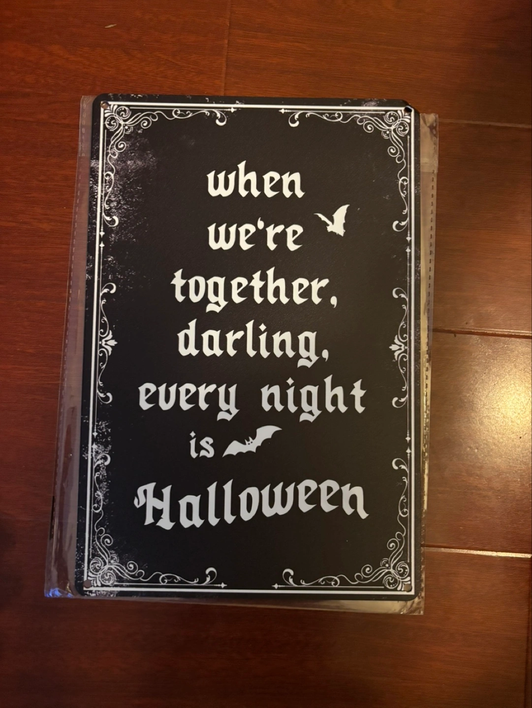 Black metal sign with white lettering. Features a Halloween quote and bat illustrations. Ornate border.