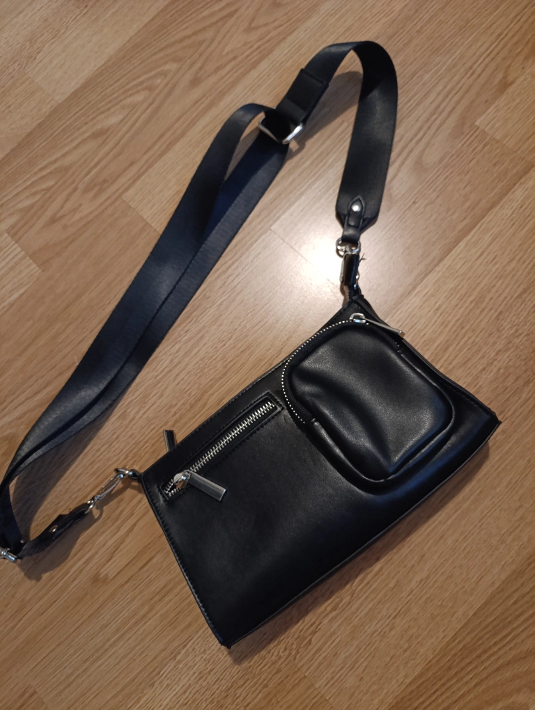 Small black crossbody bag. Features adjustable strap and zipper closures. Multiple compartments. Sleek and stylish design.
