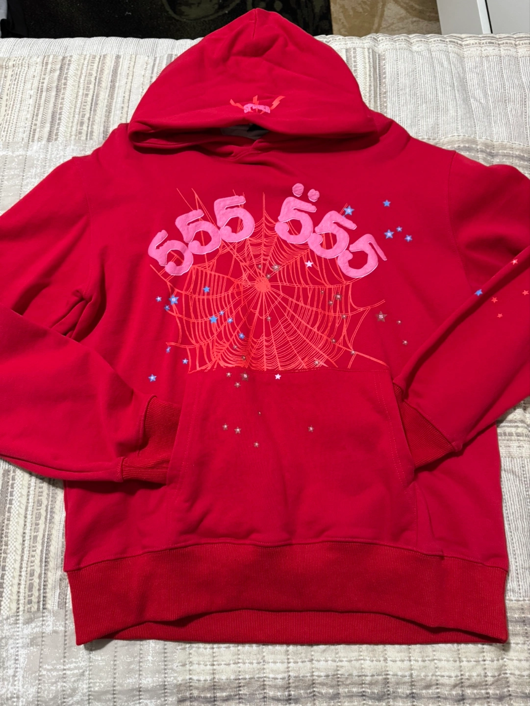 67Red hooded sweatshirt. Features a spiderweb design with 555 printed across the chest. Small stars throughout the design. Long sleeves and kangaroo pocket.