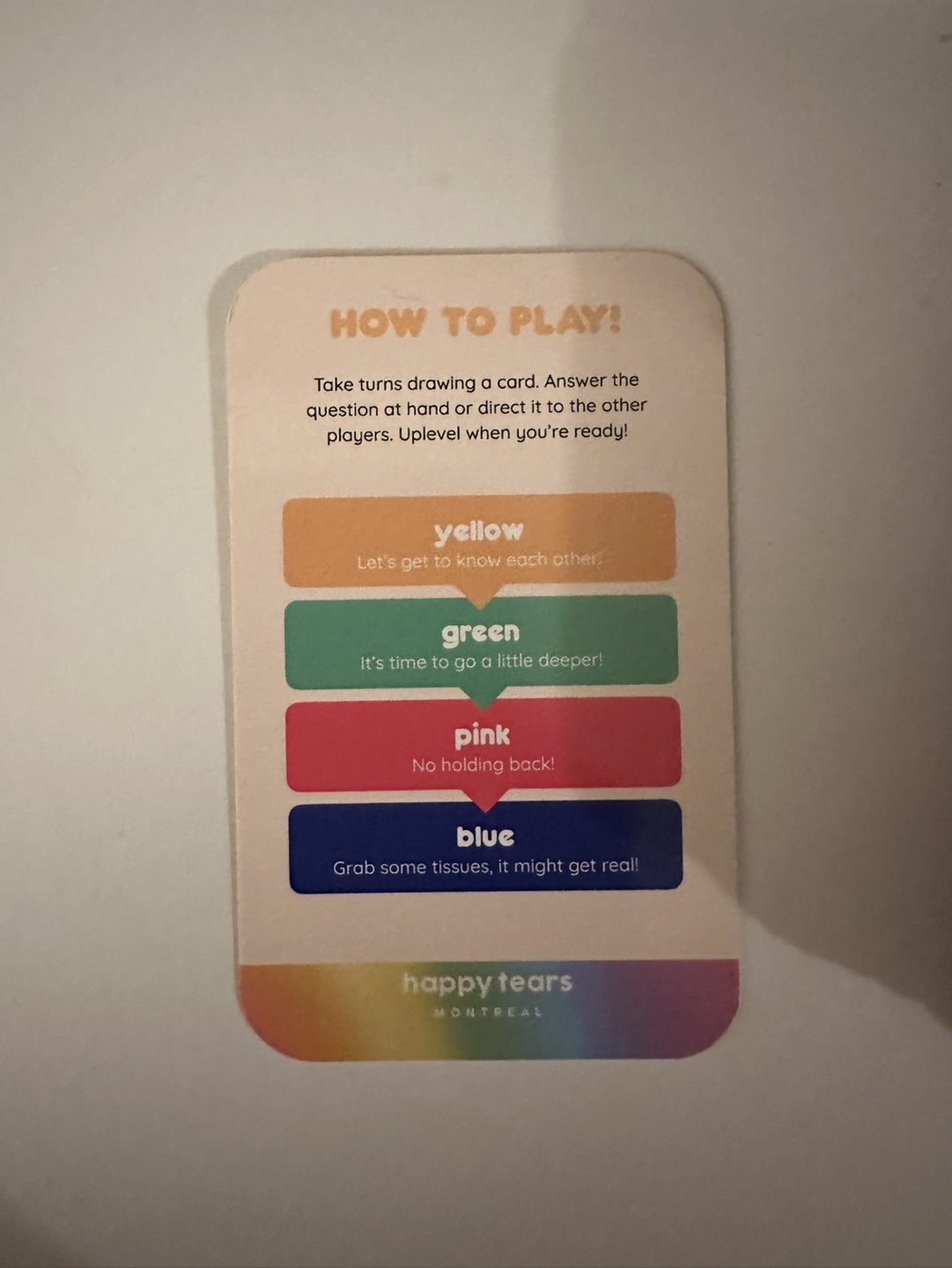 1 / 71 / 7Buy & SellHappy Tears The Connect Deck Card GameHappy Tears The Connect Deck Card GameFree120 bilingual questions for more meaningful connections. Great for parties or game nights. Includes instructions.WHERE TO MEETCheck LocationView MapSELLERverifiedMariamChurch Yonge Corridor34928 reviews3 chats·1 favorites·51 viewsSEND CHAT TO SELLERHi Mariam! I’m interested in your listing.Hi Mariam! I’m interested in your listing.Get the Karrot app to chatSign In to chat