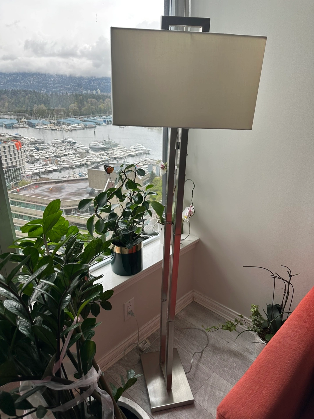 10Sleek and stylish floor lamp. Brushed nickel finish. Rectangular off-white fabric shade. Great for living room or bedroom.