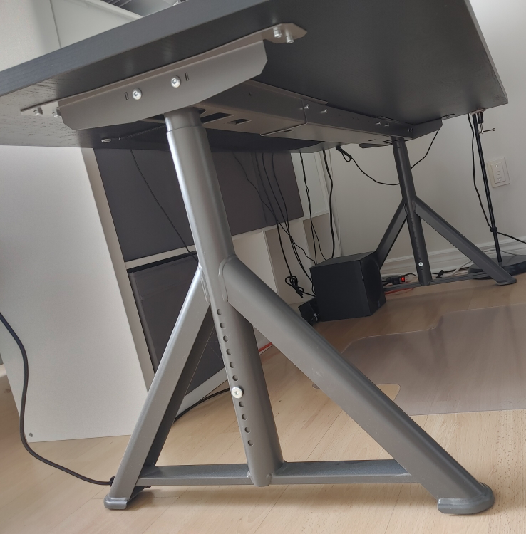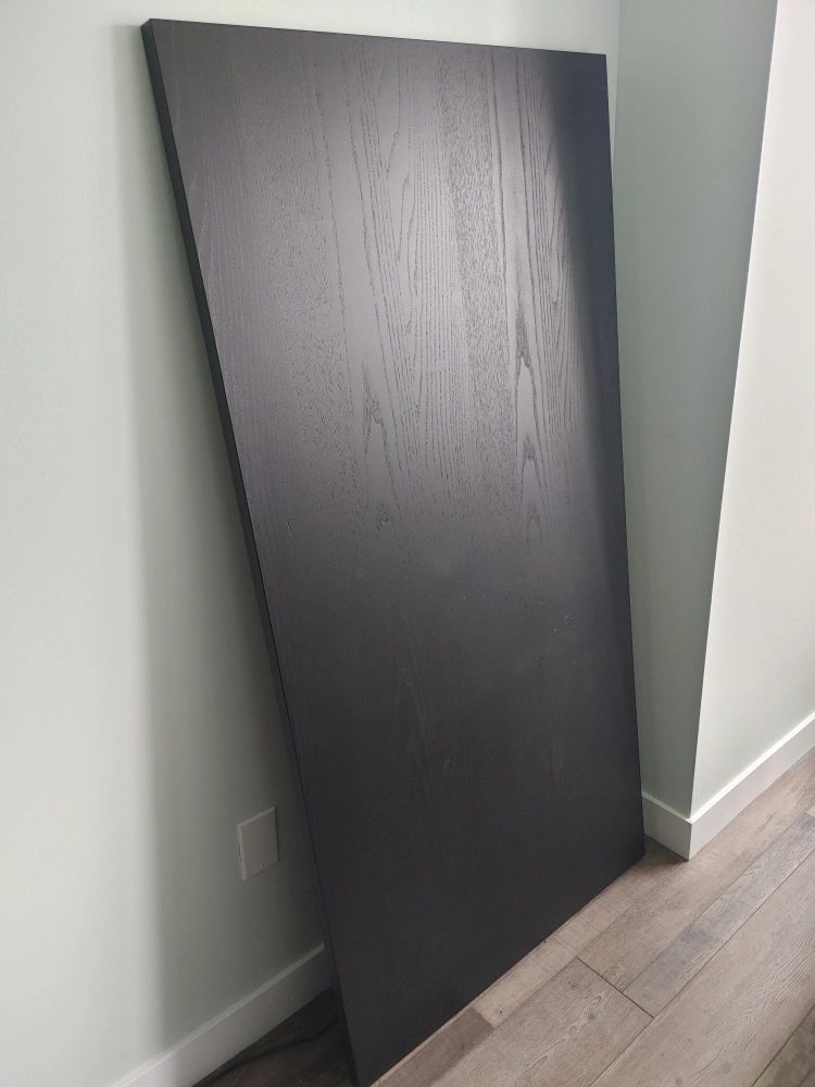 Large black desktop and matching grey metal legs. Minimalist style. Great for home office or gaming setup. Some minor wear.
