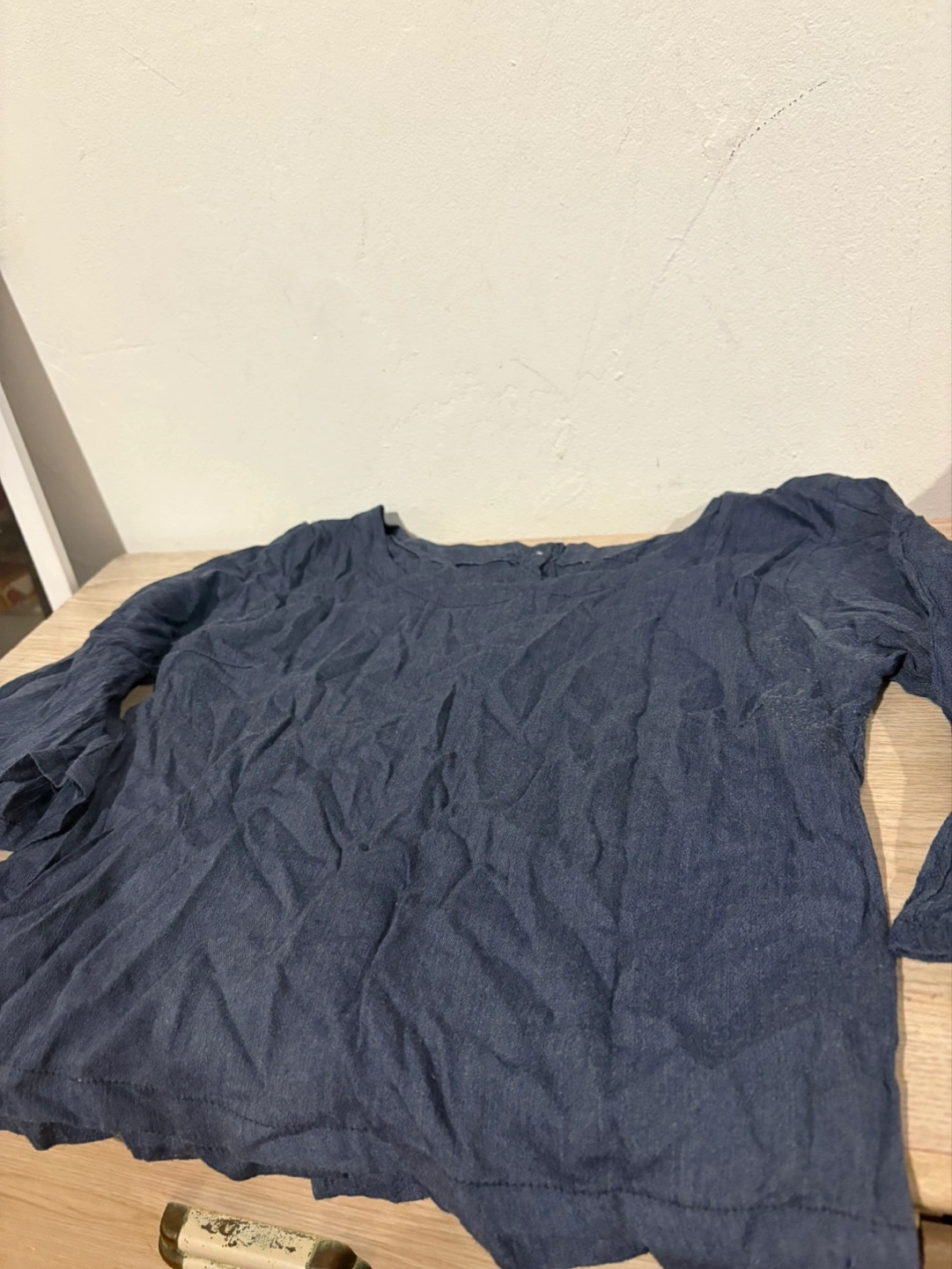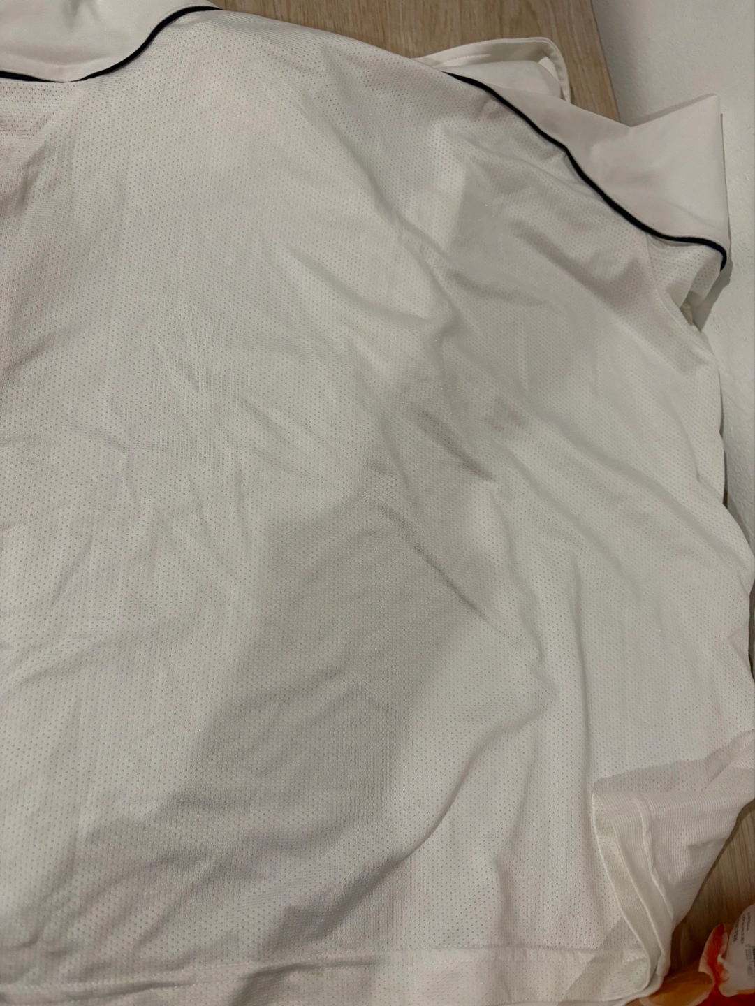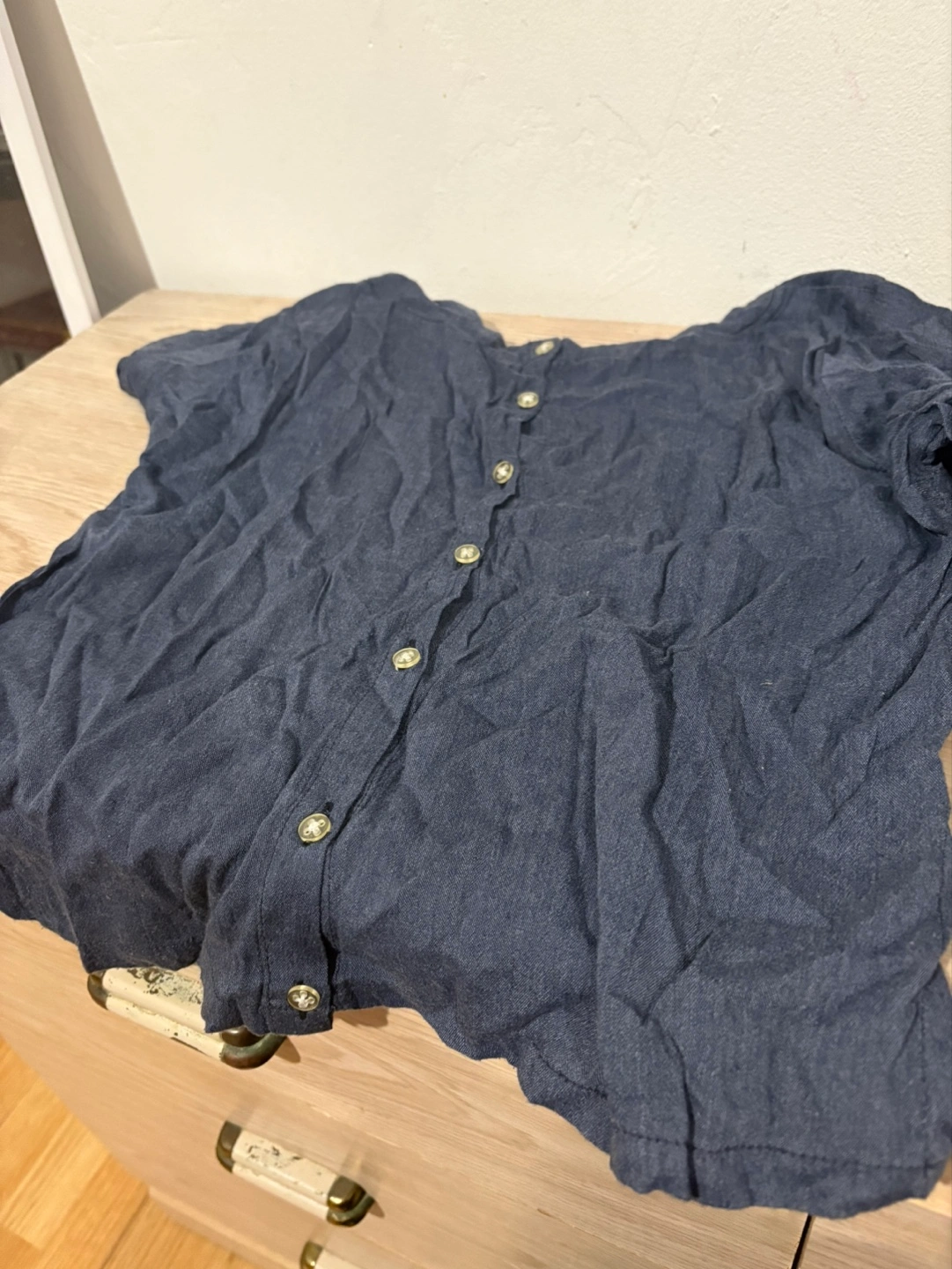 Bundle includes three women's tops. One dark blue, button-down top with three-quarter sleeves. One white embroidered top with cold-shoulder detail. One white athletic polo shirt. Sizes vary.