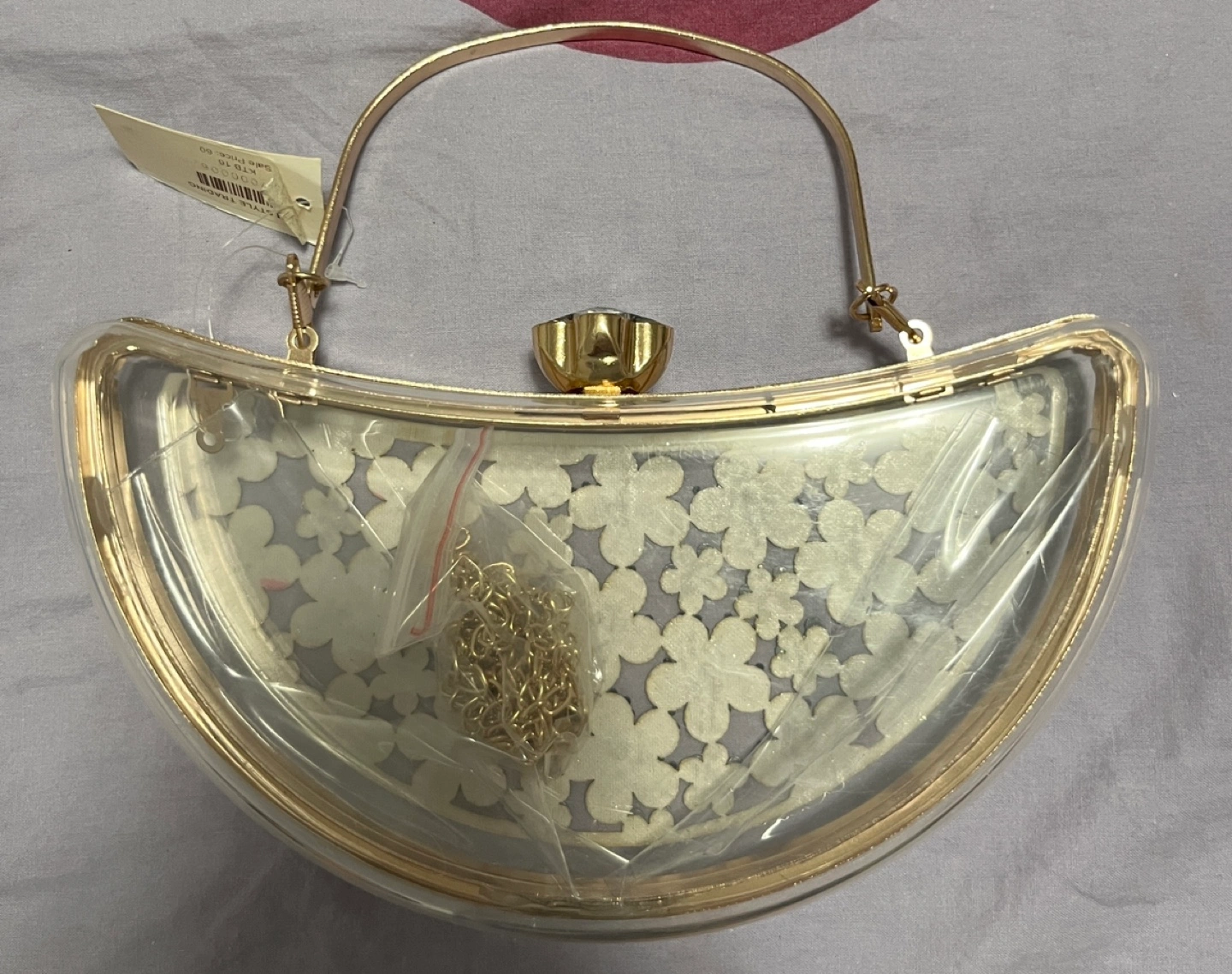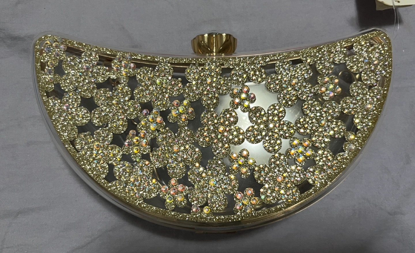 Beautiful gold glitter and clear acrylic evening clutch. Half-moon shape. Features a gold-tone clasp and removable chain strap. Perfect for special occasions.