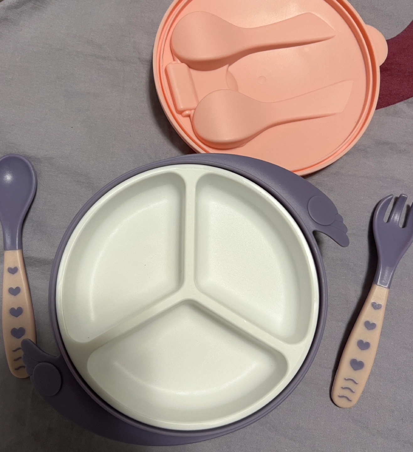 Baby double layer bowl. Features detachable suction cup base and compartments. Includes a spoon and fork. BPA free. Suitable for 6+ months.