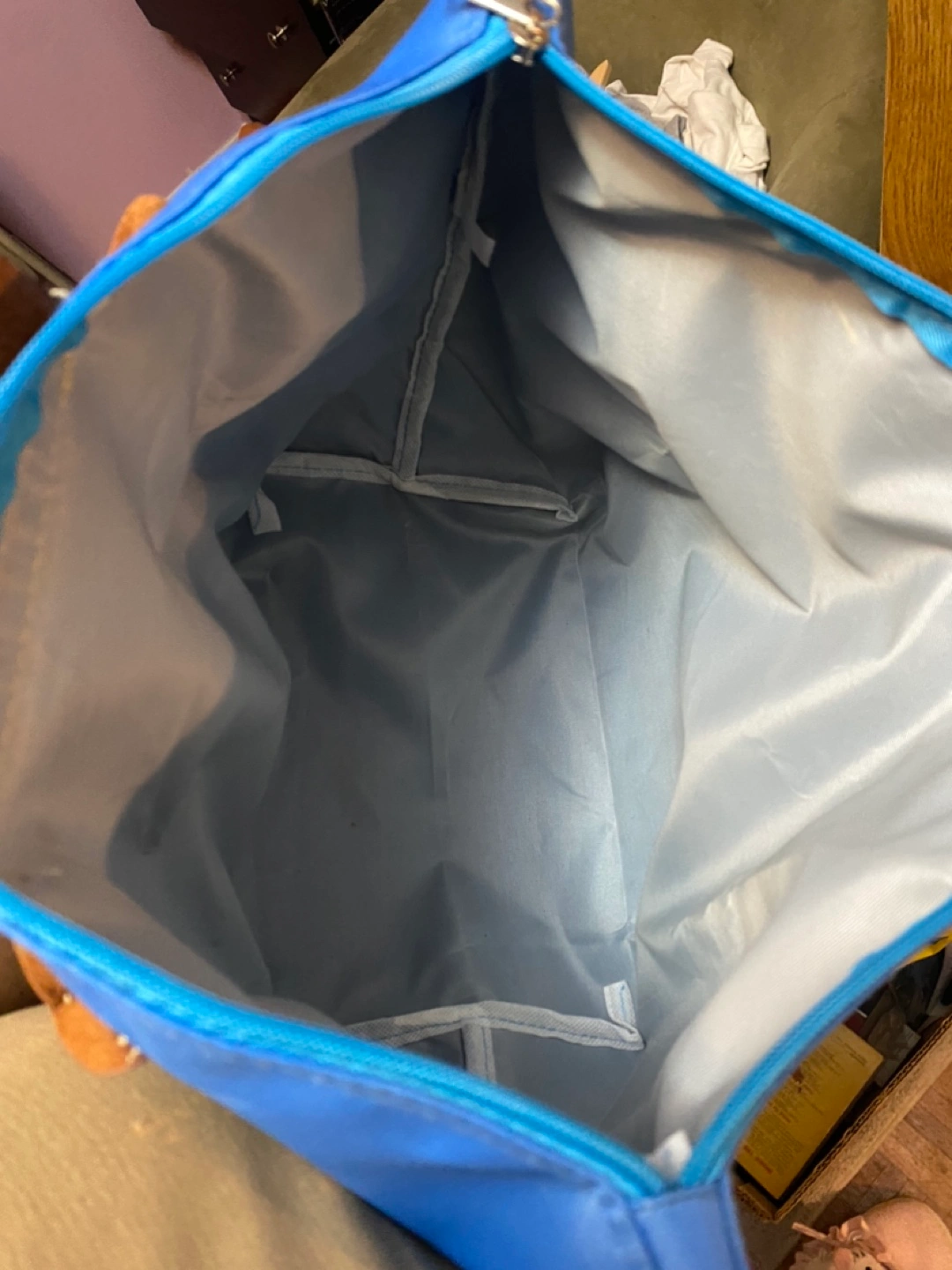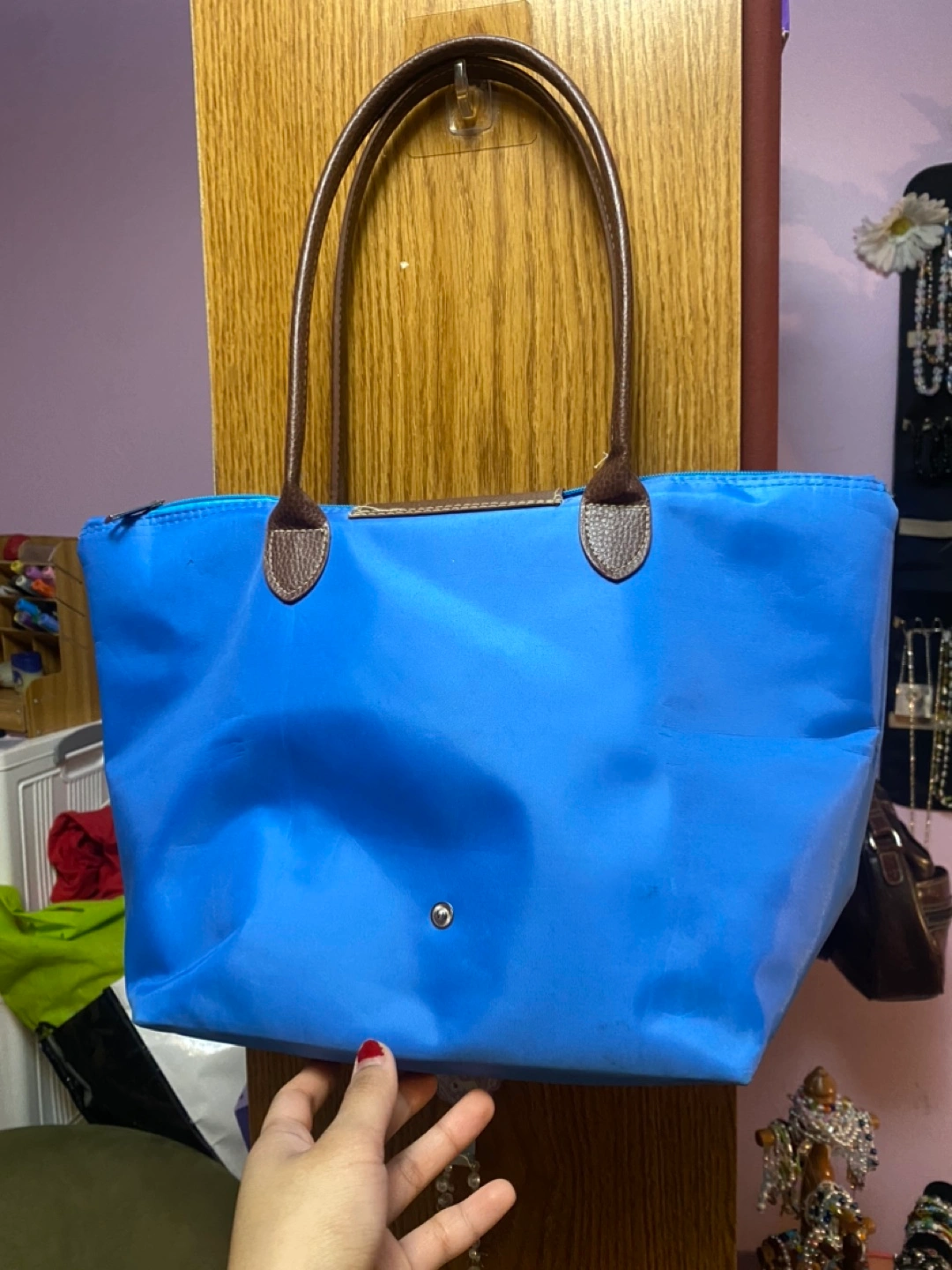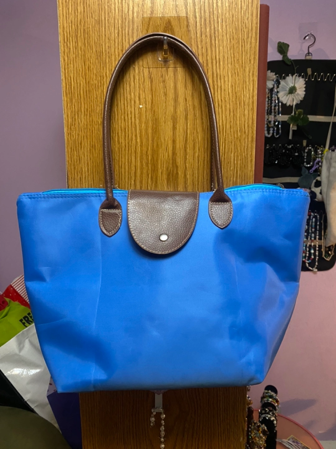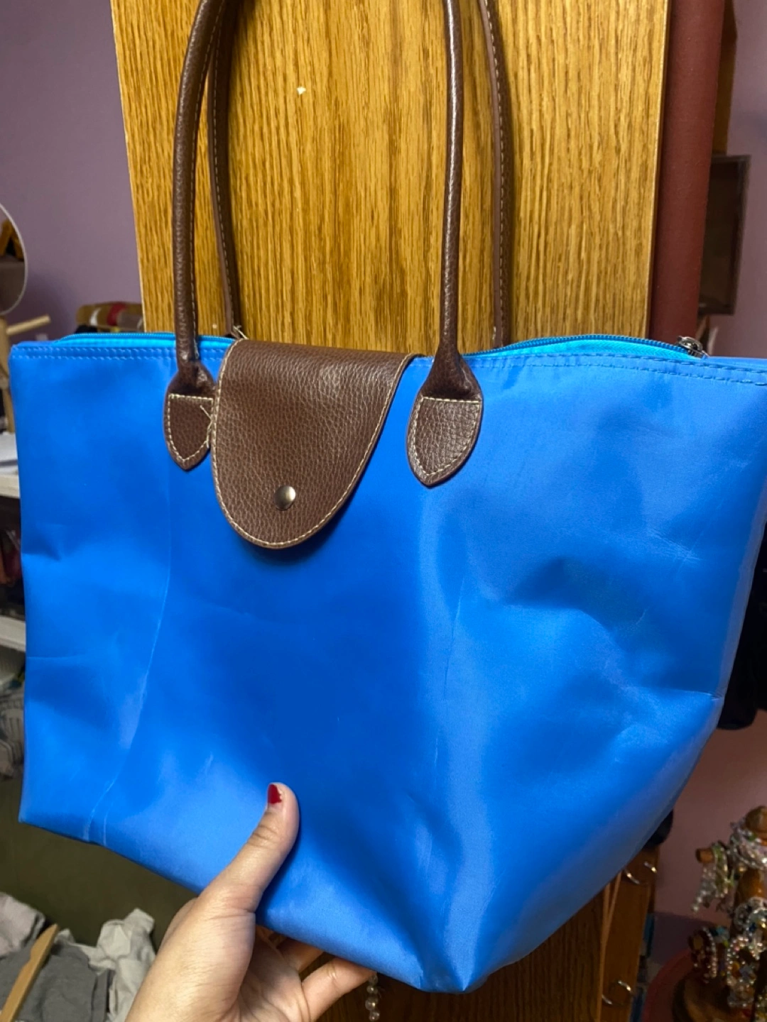 Lightweight tote bag. Bright blue nylon exterior. Brown leatherette handles and accents. Zip closure. Interior pockets. Great for everyday use.