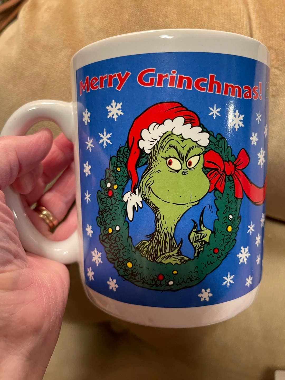 Large ceramic mug. Features Grinch in Santa hat inside a Christmas wreath. Blue background with snowflakes. Merry Grinchmas! text. Holds 3 cups rather then the 1 cup regular size mug.