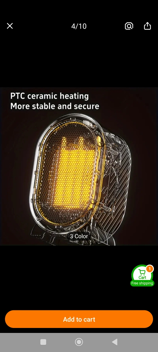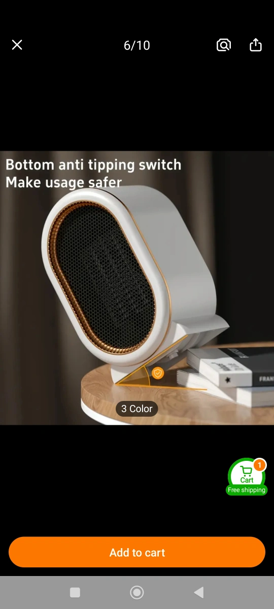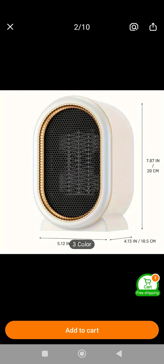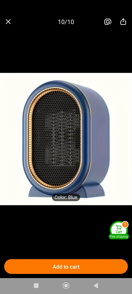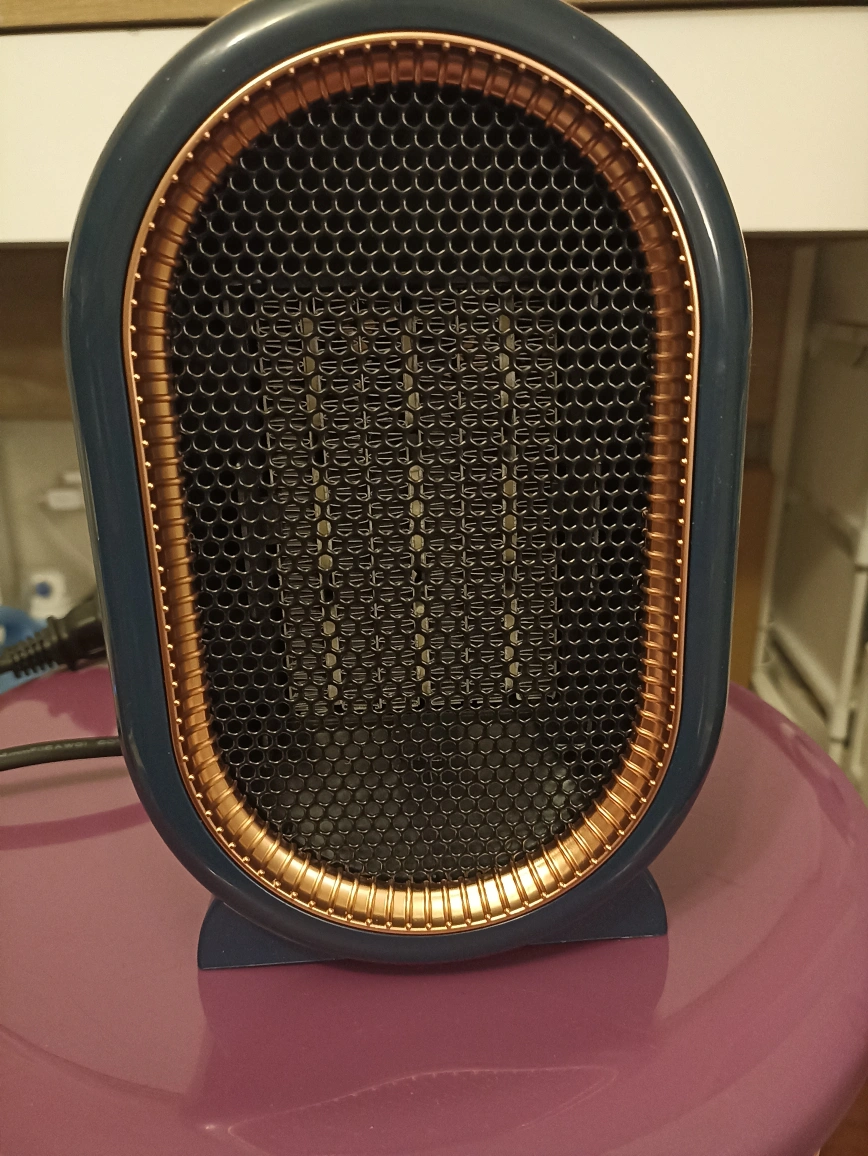 Compact and portable desktop electric heater. Features PTC ceramic technology, flame-retardant safety features, anti-tip protection, and a US plug. One-click switch with two-gear adjustments.