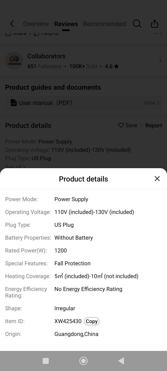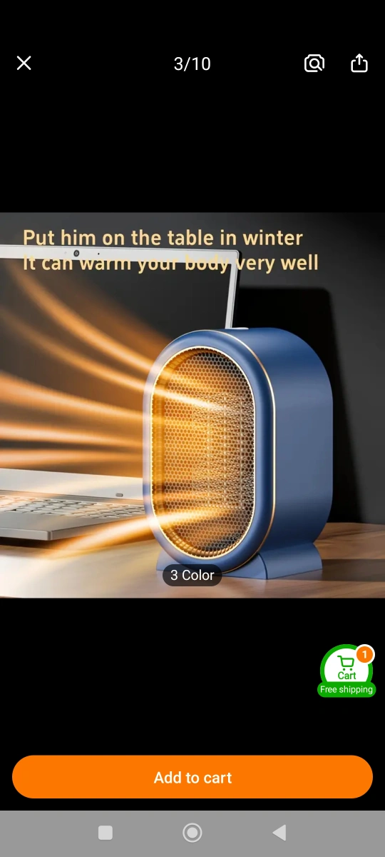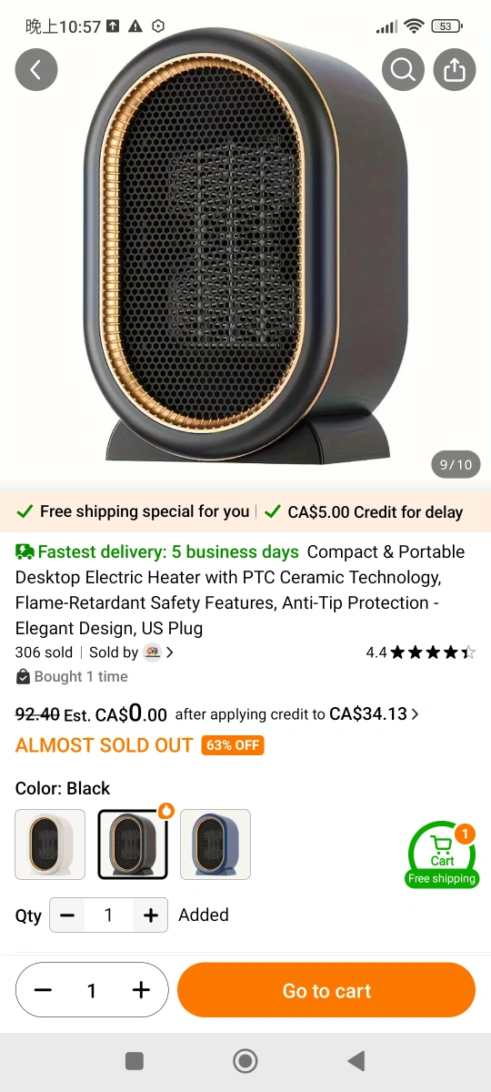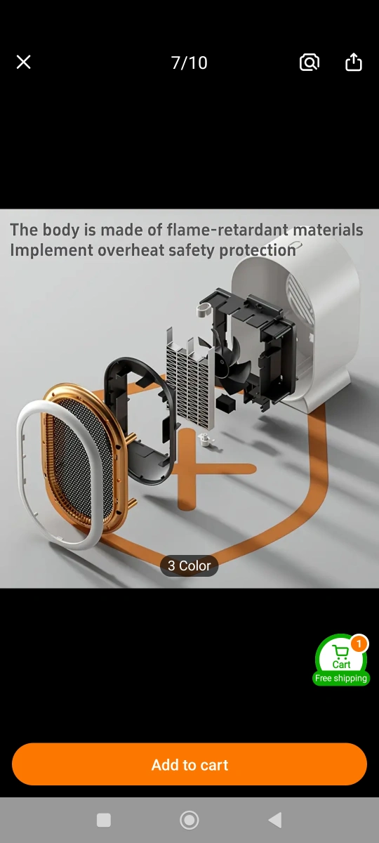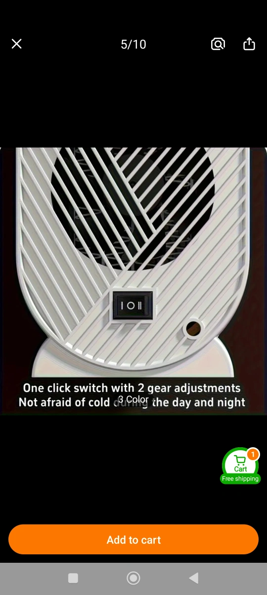 Compact and portable desktop electric heater. Features PTC ceramic technology, flame-retardant safety features, anti-tip protection, and a US plug. One-click switch with two-gear adjustments.
