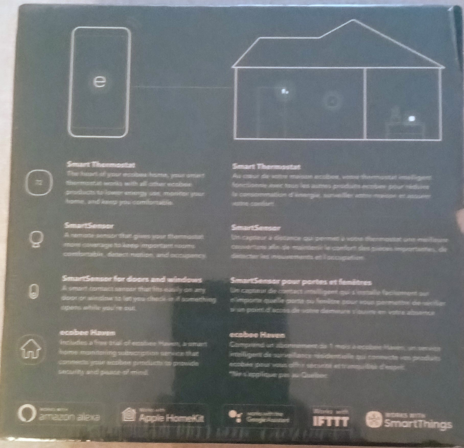 Brand new package sealed Smart thermostat package. Includes whole-home sensors. Works with Alexa, Apple HomeKit, Google Assistant, IFTTT, and SmartThings. Energy-efficient design. Remote sensor for optimal comfort.