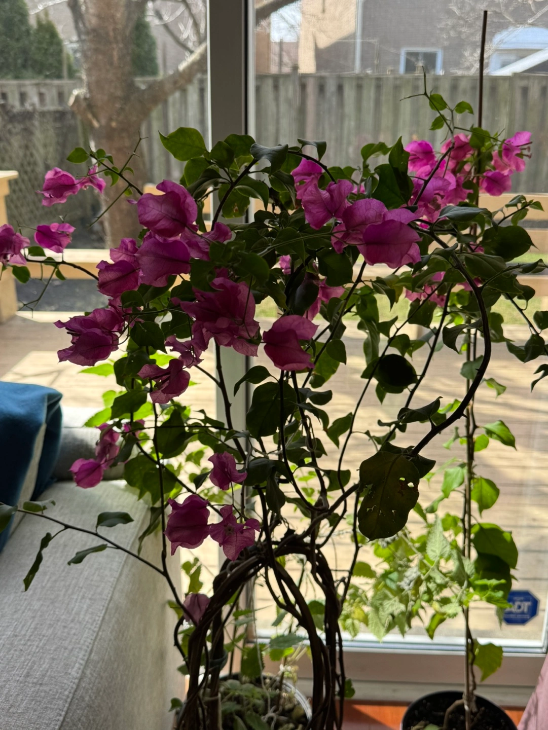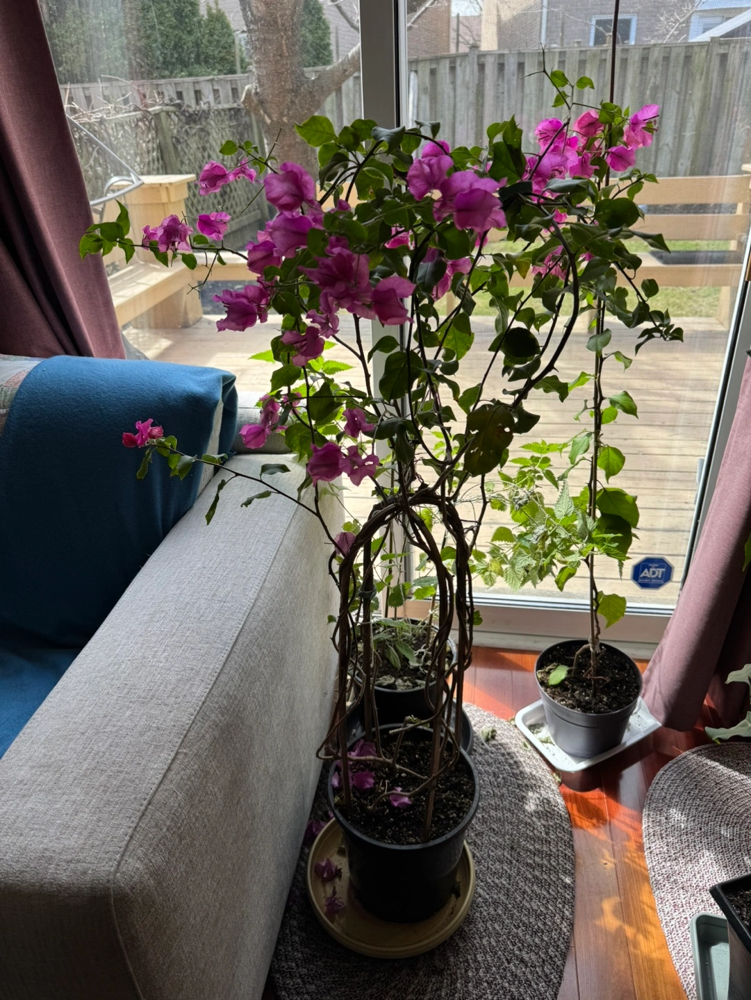 Beautiful bougainvillea plant, vibrant purple flowers. Planted in a black pot with a decorative woven trellis. Healthy plant, currently blooming.
