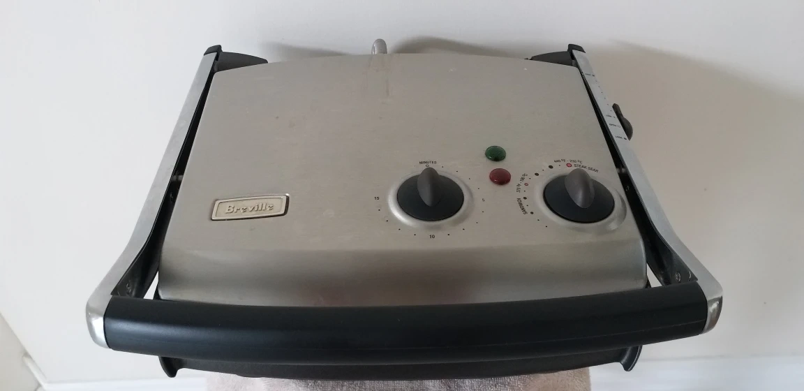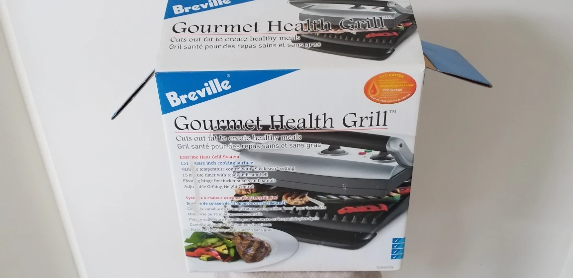 Used Breville Gourmet Health Grill. Features adjustable temperature and height settings. Great for healthy cooking. Only used couple times.