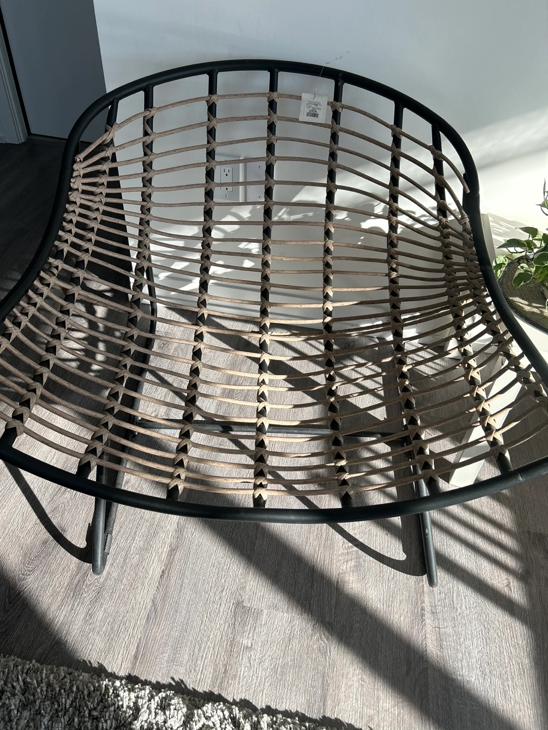 Stylish woven rattan chair. Black metal frame. Comfortable and unique design. Perfect for living room or patio.