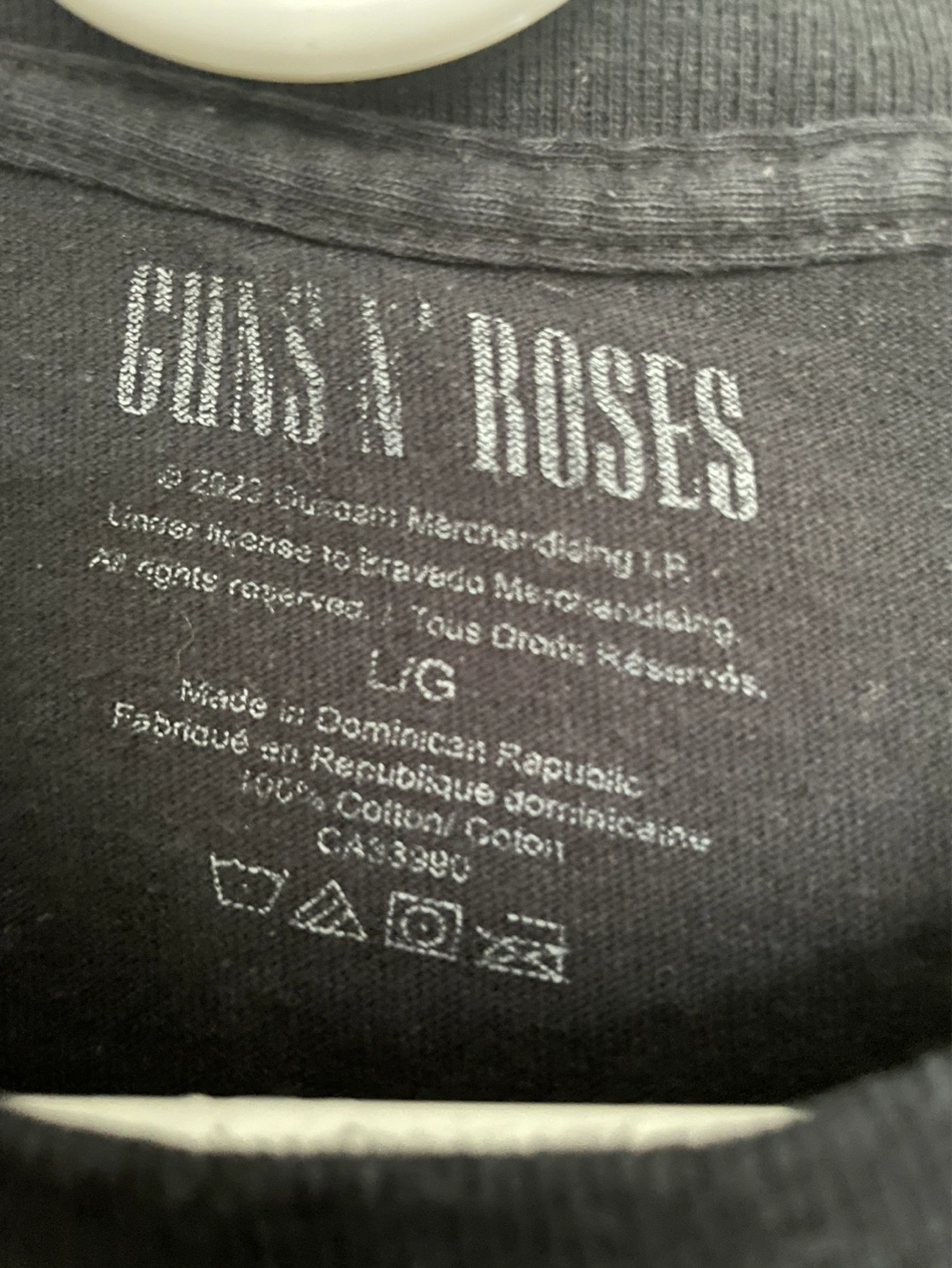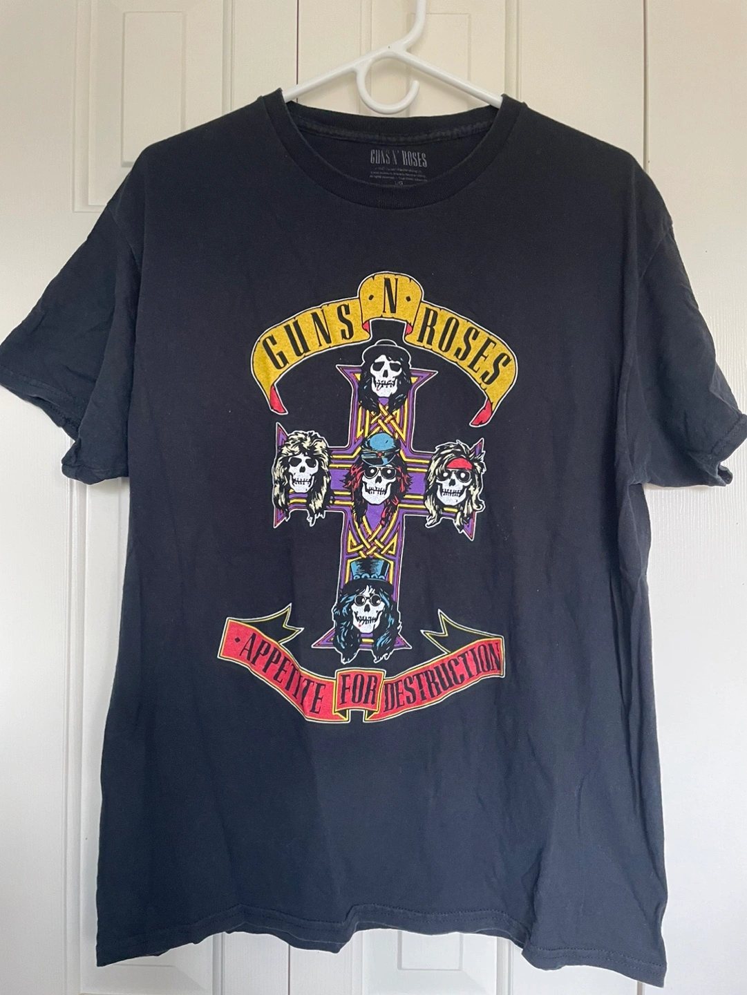 Black Guns N' Roses band tee. Features Appetite for Destruction graphic. Short sleeves. Men's sizing.
