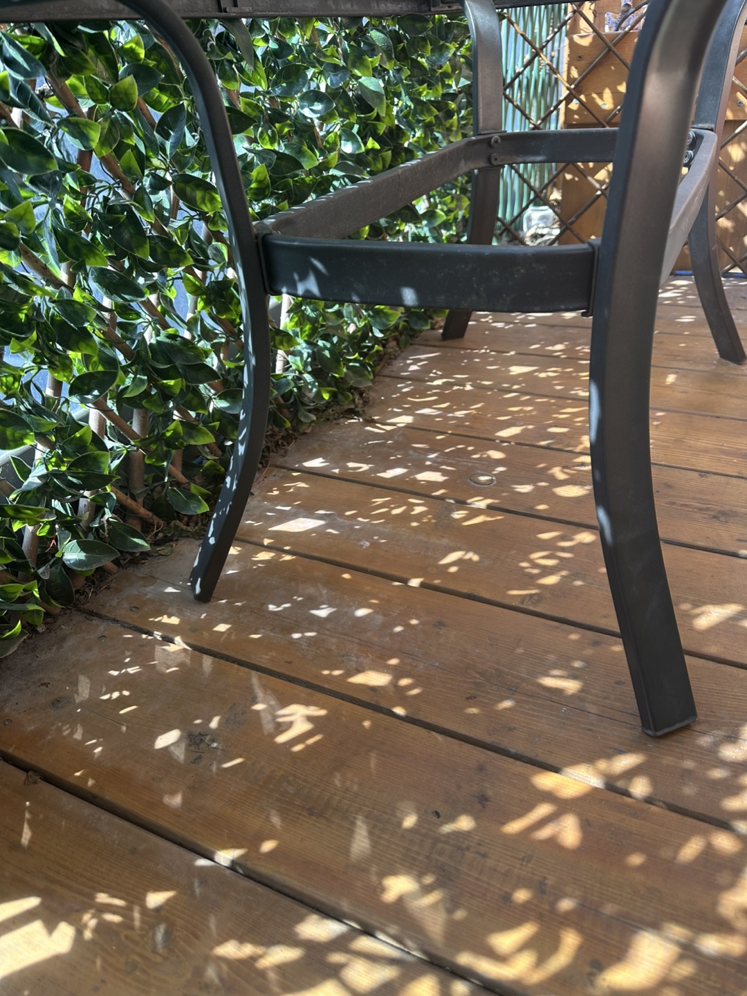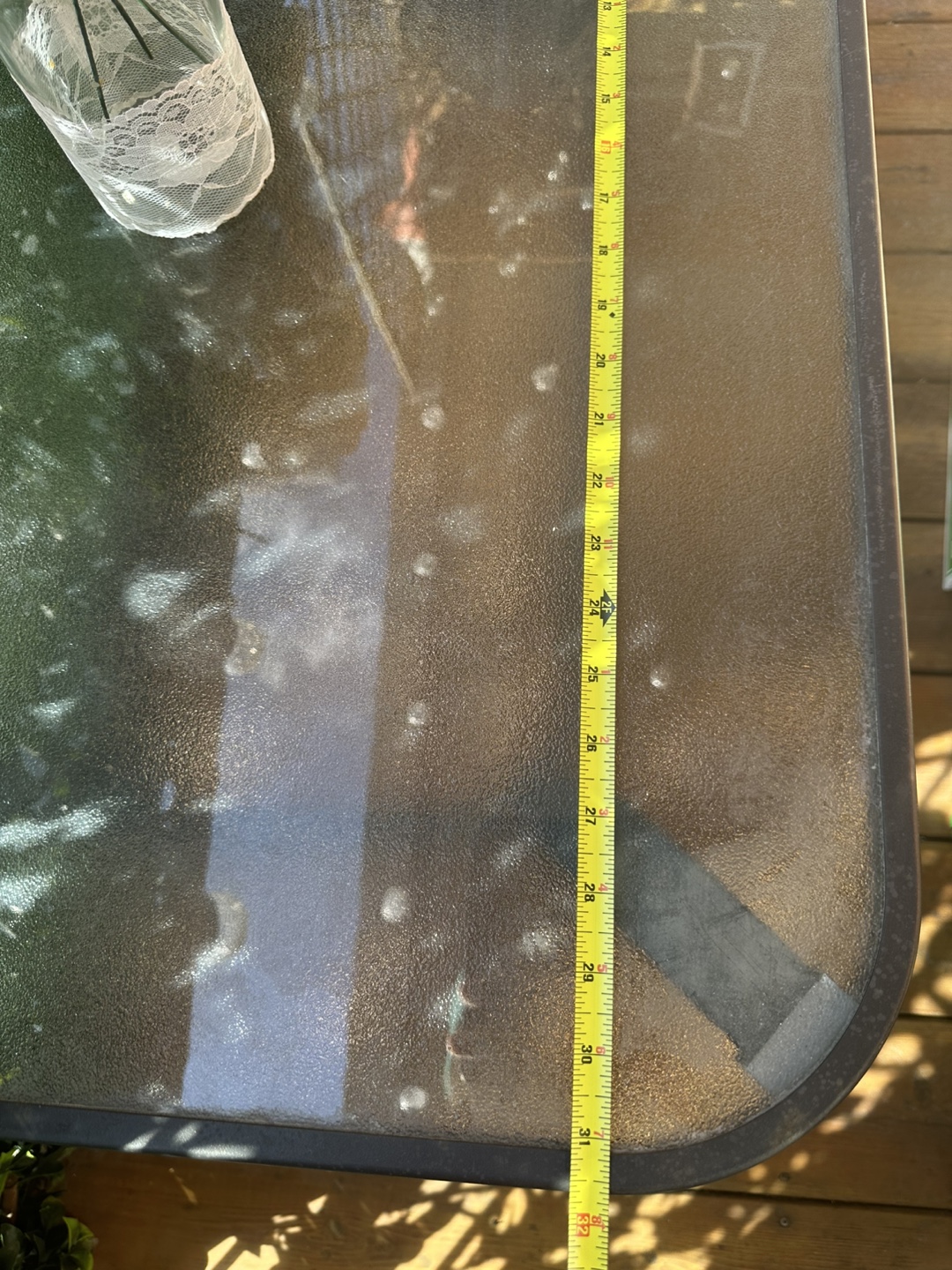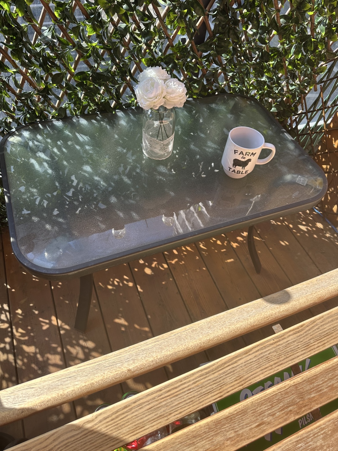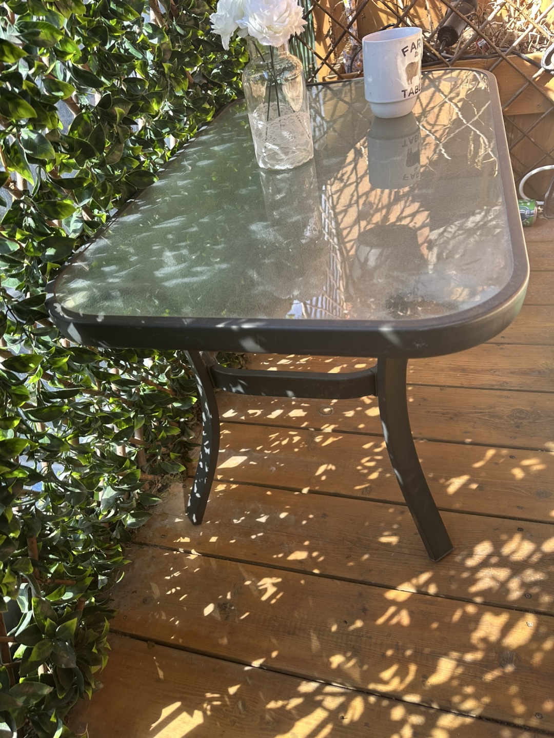 Small outdoor patio table. Glass top and black metal frame. Measures approximately 18" wide x 32" long x 18" high. Great for small spaces.