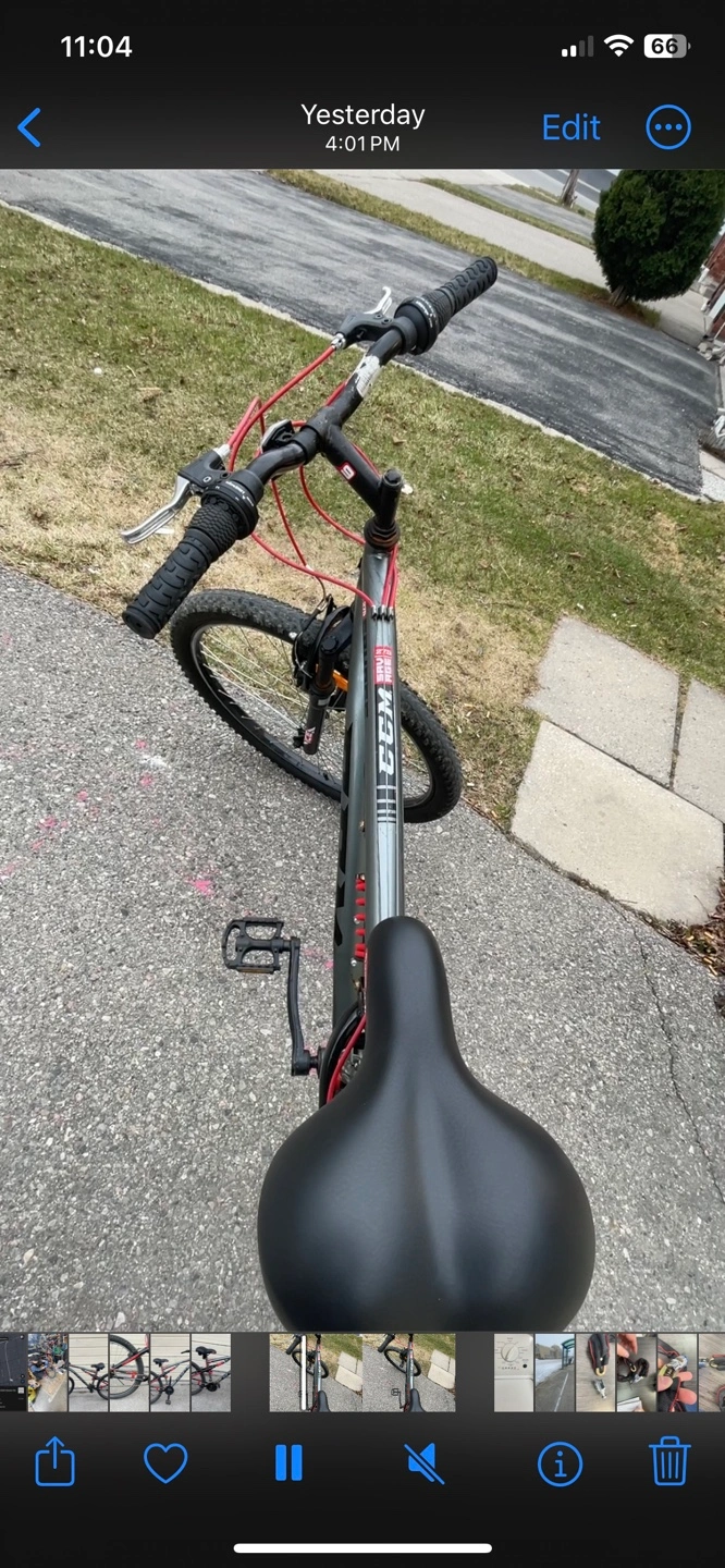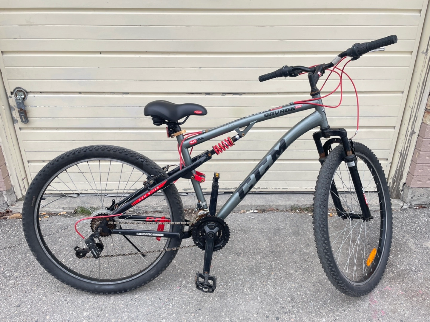 Pre-owned CCM Surge mountain bike. 26-inch wheels. Features front suspension. Shimano components.
