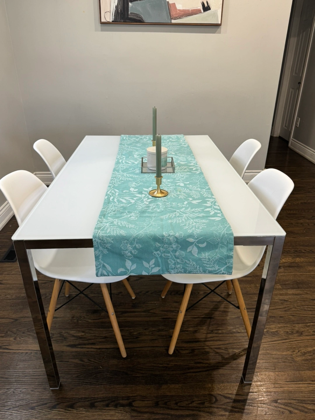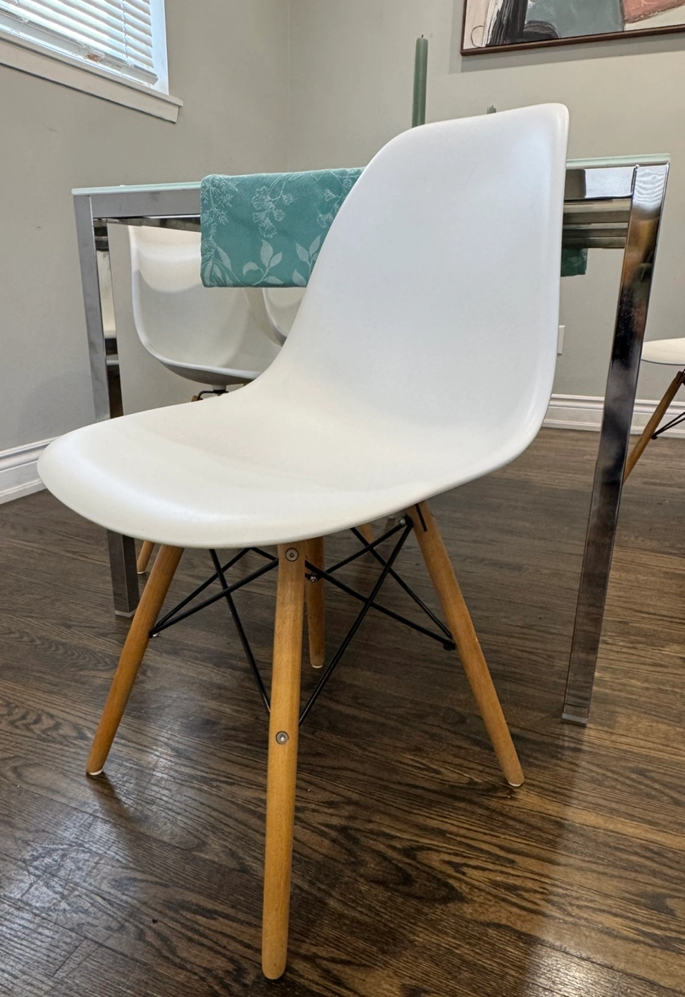 Sleek glass-top dining table. Chrome legs. Four included white plastic chairs. Light wood legs. Minimalist design. Perfect for small spaces.