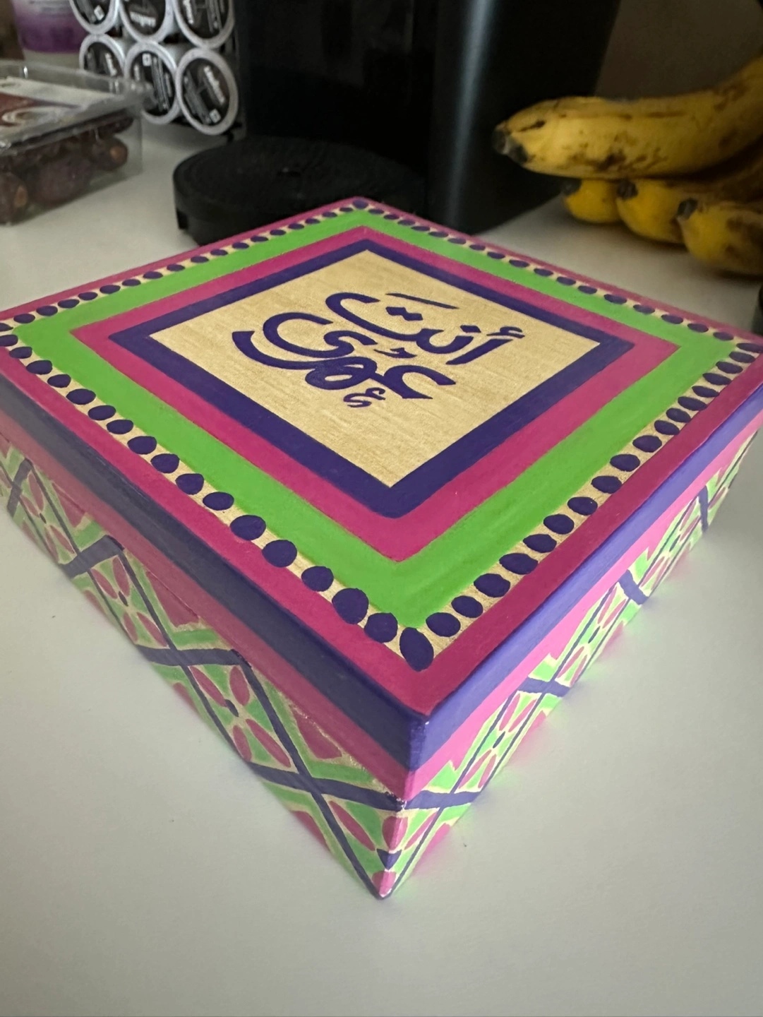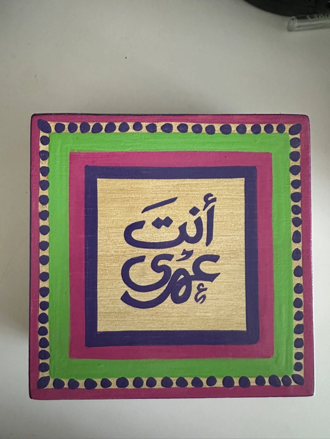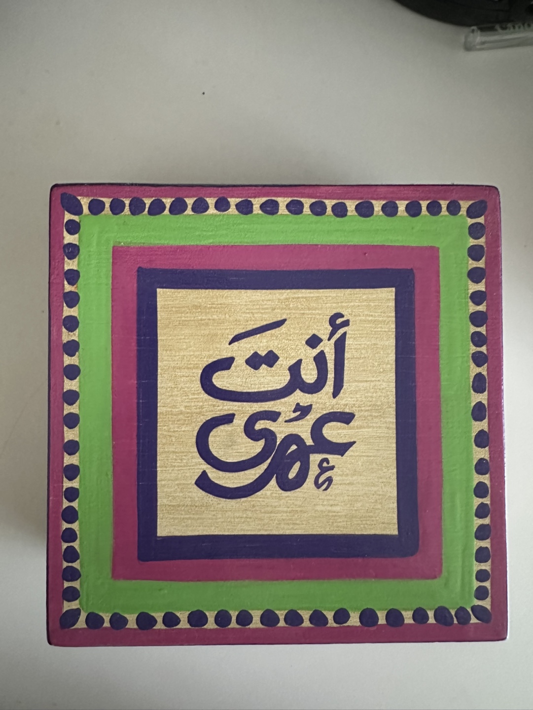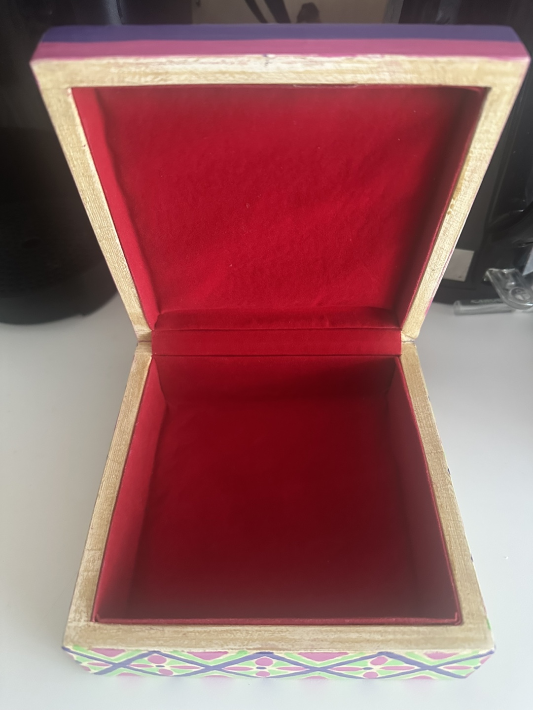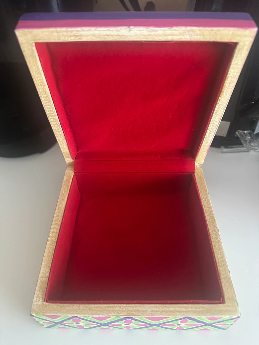 I purchased this from Egypt. Barely used. hand-made. The Arabic reads: “You are my life”. Square wooden box. Hand-painted design. Features vibrant colours and Arabic calligraphy. Red velvet interior. Medium size, perfect for trinkets or jewellery.