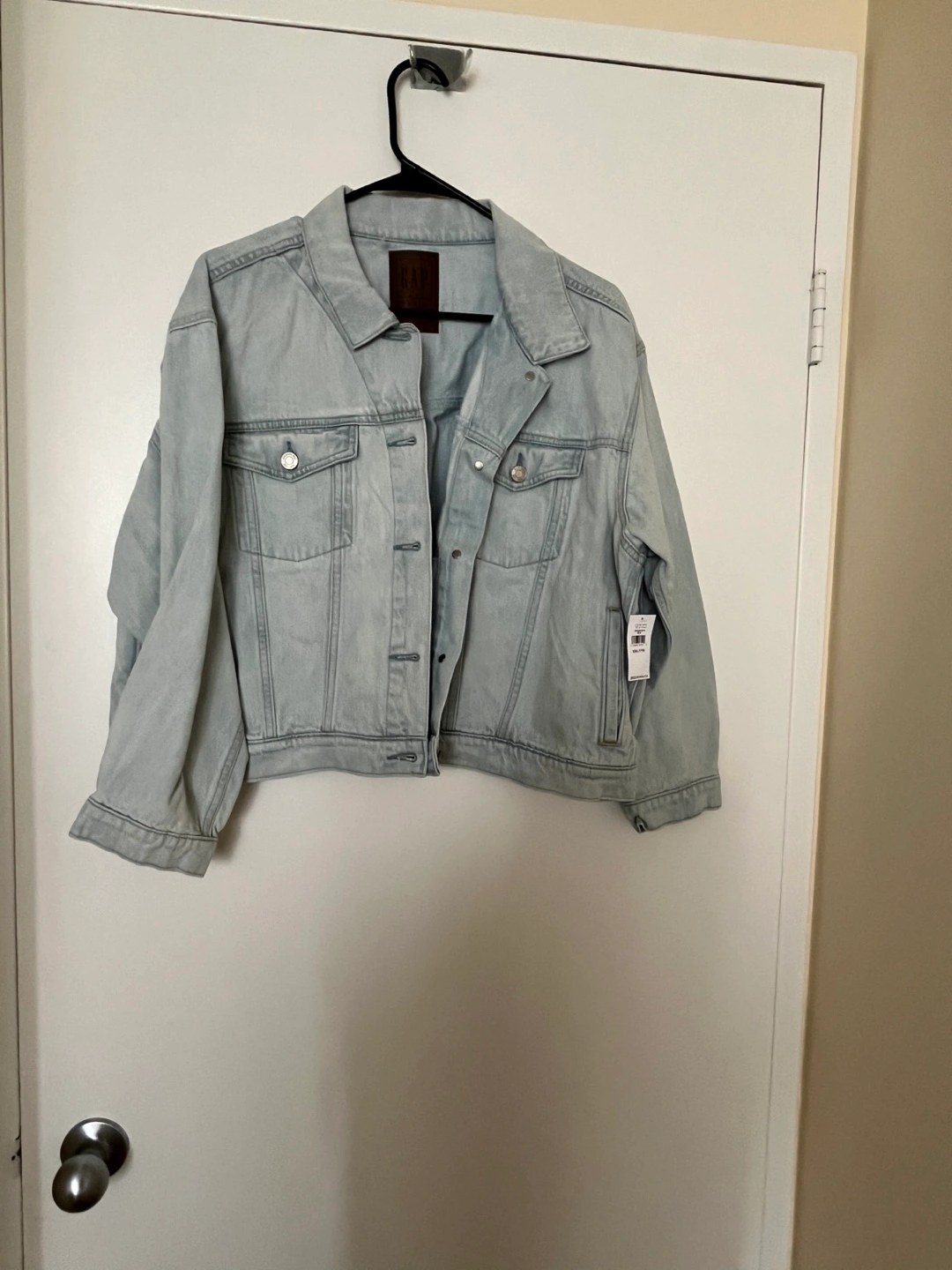 Women's light wash denim jacket. Boxy fit. Long sleeves. Button closure. Two front pockets.