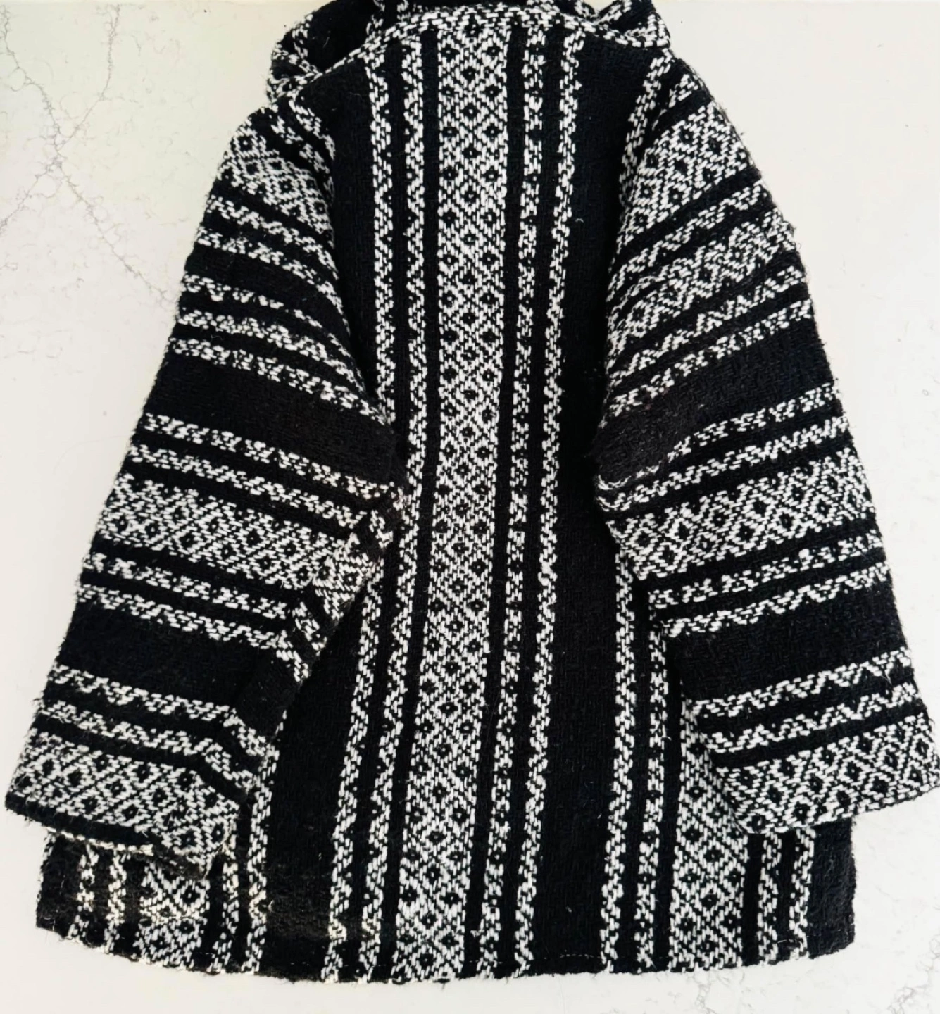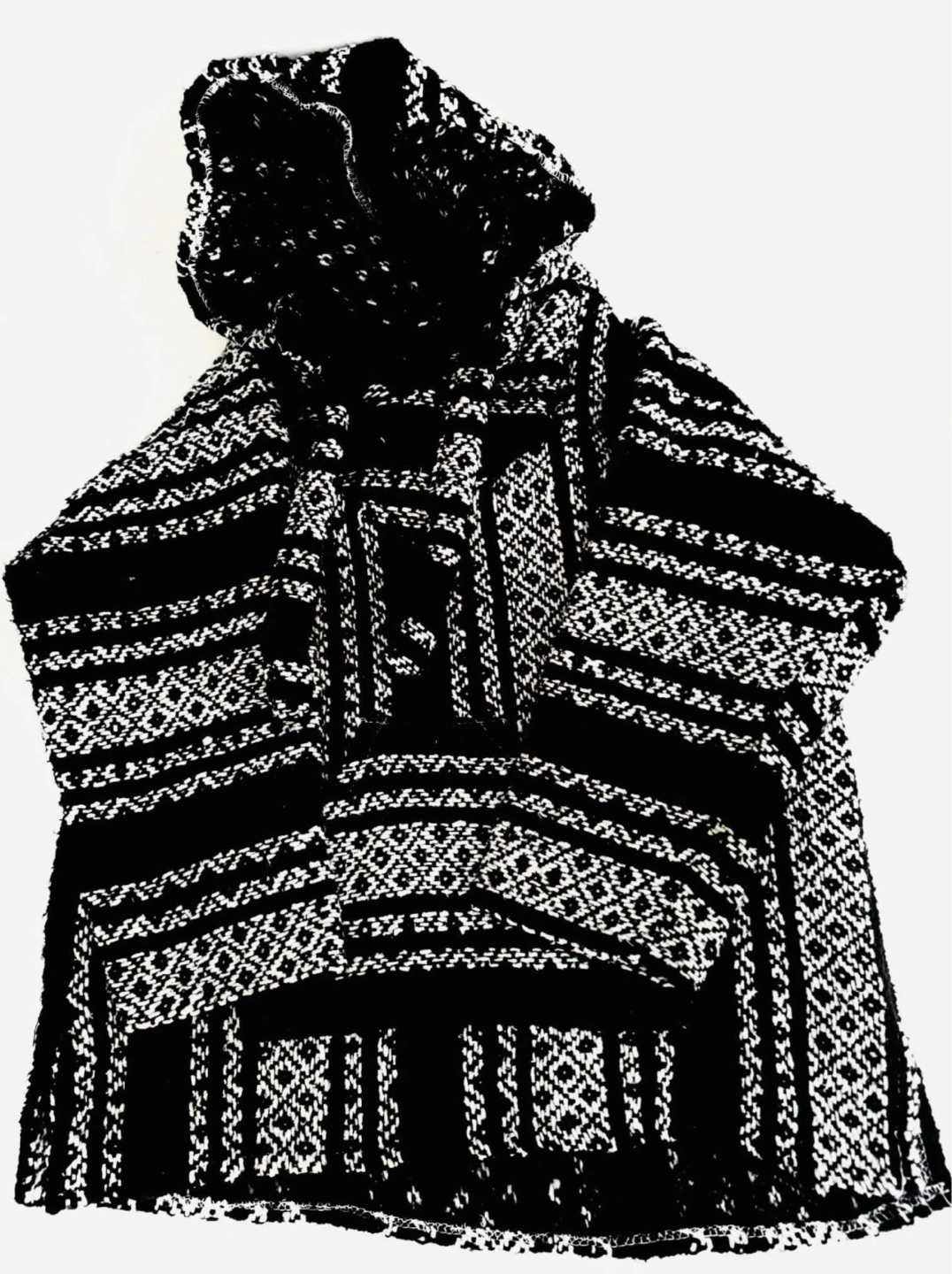 New, still has original vendor tag. Fits sizes xs and small best. Baja hoodie/drug rug style, mid-length sleeve. Very soft and warm inside! This was an impulse buy from a street vendor on a trip to Mexico this summer that I never ended up wearing out lol. Would be a great fall piece. It has a slit design on the sides and is fleece lined throughout, including the hoodie and pocket.