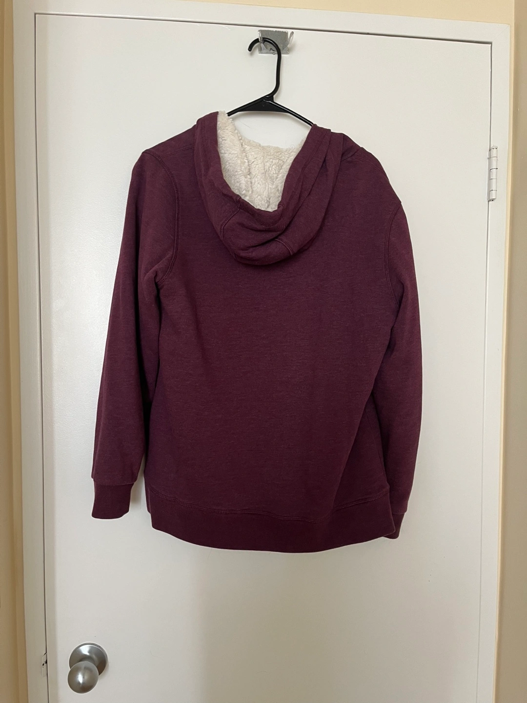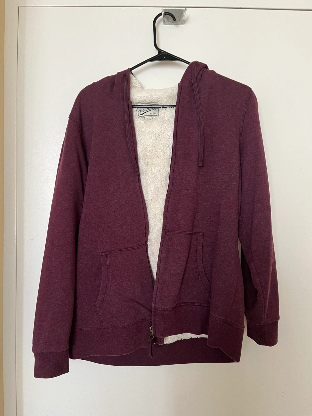 Burgundy zip-up hoodie. Fleece-lined interior. Long sleeves. Hooded. Great for colder weather.