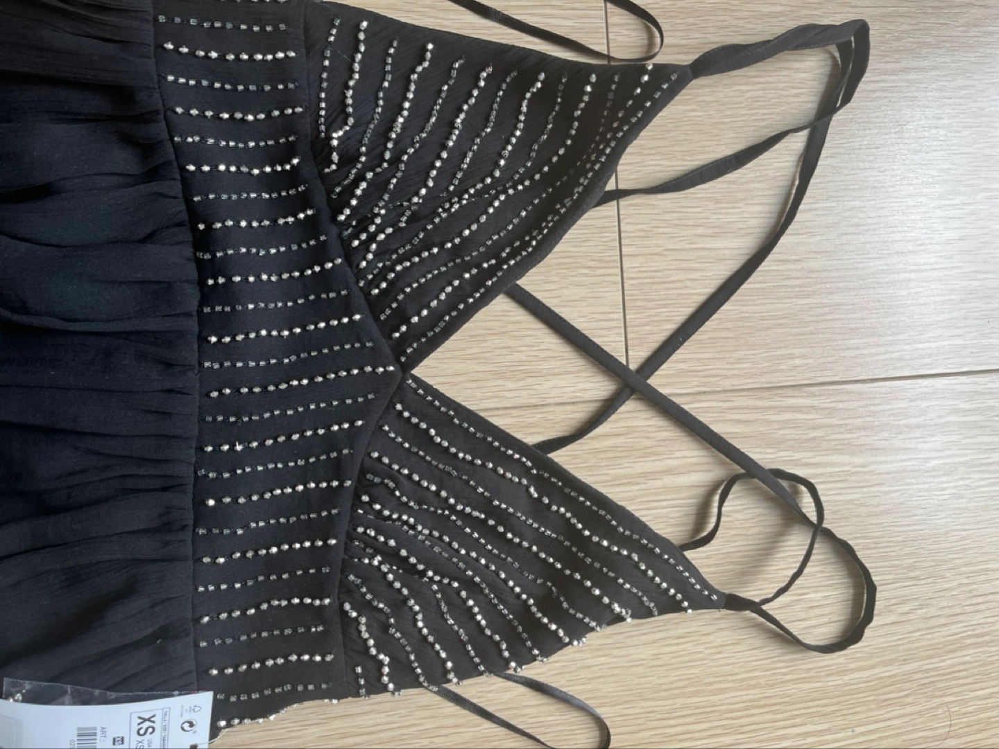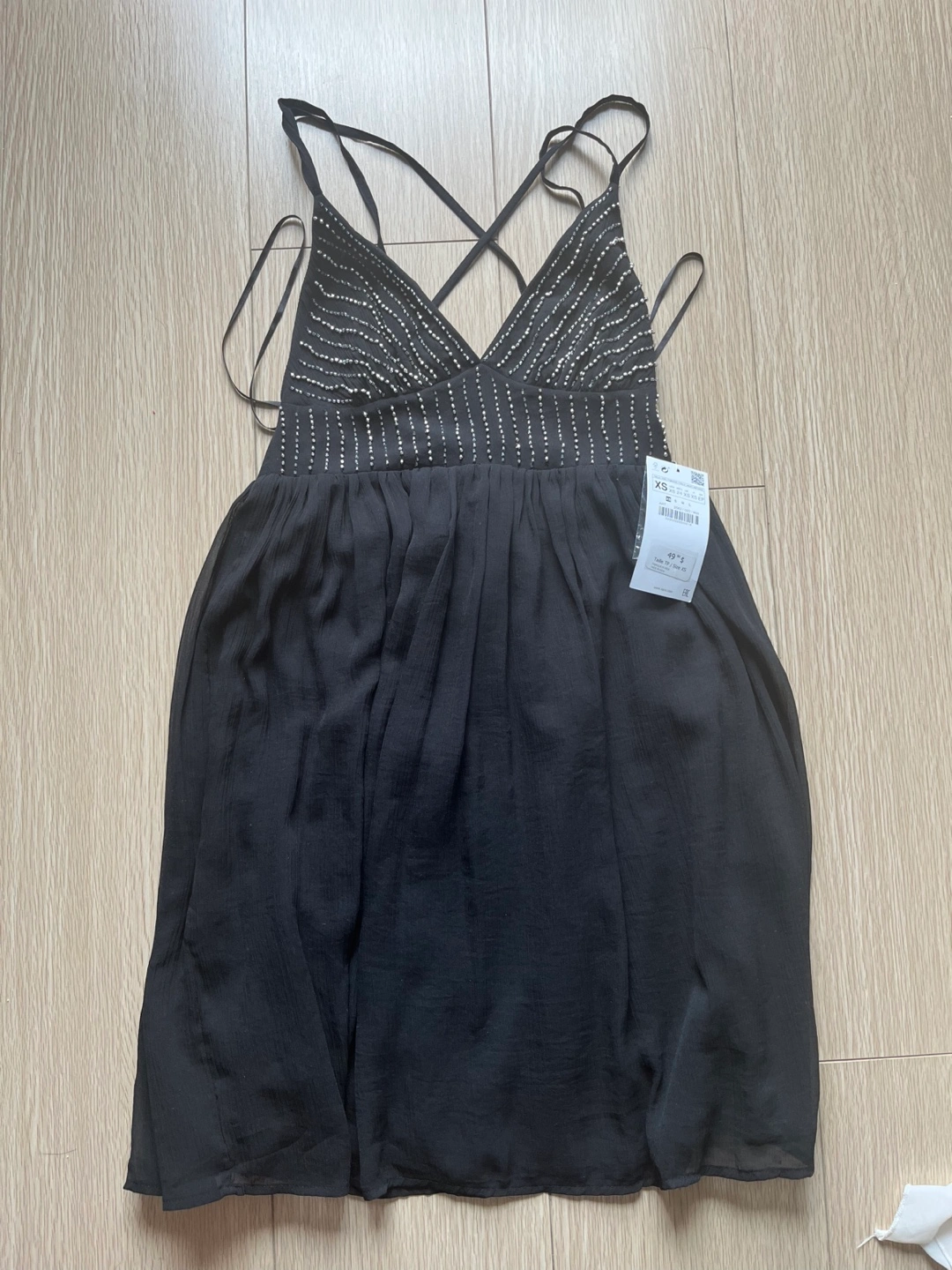 52Gorgeous black mini dress. Features delicate beading detail. Cross-back straps. Size XS. New with tags.